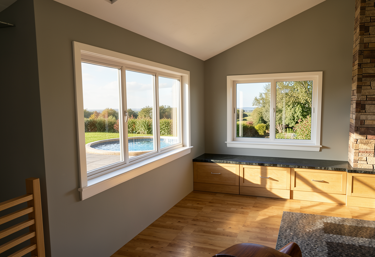 need to redesign the fron of this home so it has an organic feel with stone also would like large floor to ceiling windows just left very left the entrance as that is the dining room to the left of that is garage storage want stucco and light colored stone