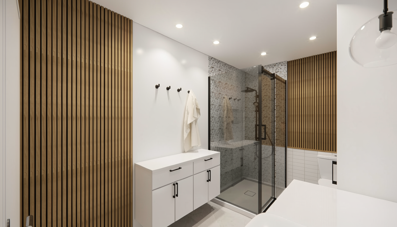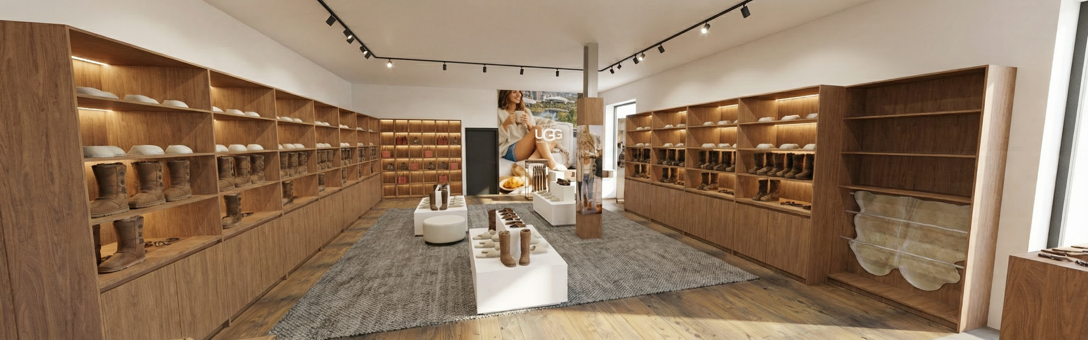 ensure the interior is light and bright fill the room with lots of light warm artificial lighting balanced with natural light and shadows add testure to the carpet ensuing the pattern and colours are retained add soft textures tot he timber materials though out ensure the retail displays have led recessed lighting under the shelves ensure the ceiling is black