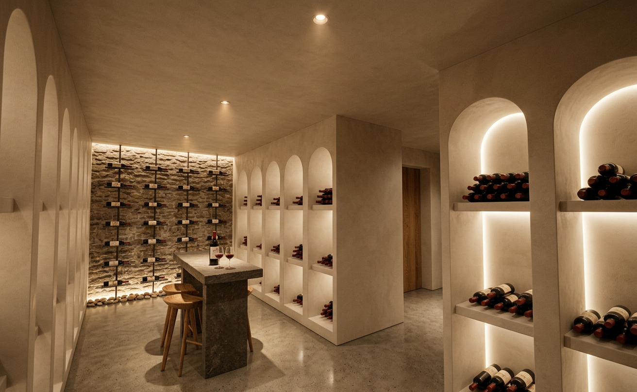 a photorealistic architectural rendering of an elegant wine cellar with arched wall niches displaying wine bottles stored horizontally the space features soft beige lime plaster walls and a flat straight ceiling finished in the same lime plaster creating a seamless continuous mineral surface the floor is finished in smooth grey beige polished concrete slightly lighter in tone to create a softer and more luminous atmosphere along the back wall a rustic natural stone wall is subtly highlighted by a warm led backlight at its base revealing small decorative pebbles placed along the floor line a thin and discreet metal edge trim is installed at the base of the stone wall to neatly retain the pebbles and create a refined architectural detail built in arched niches are softly backlit to illuminate the bottles and enhance the depth of the alcoves the wine bottles remain stored horizontally within the niches preserving the original layout and composition at the center of the room a solid brown grey stone tasting table stands with natural wooden stools two discreet ceiling spotlights focus warm light onto the table creating a central focal point the table includes small elements that bring life to the space such as a wine bottle two or three wine glasses a corkscrew a few natural corks and a small tasting plate creating a subtle lived in and welcoming atmosphere additional recessed ceiling lighting illuminates the right side of the space including an extra ceiling spotlight placed in the secondary area on the right to enhance the architectural niches and add depth to the composition a simple wooden door is visible in the background the lighting is warm and atmospheric emphasizing texture depth and material realism with cinematic shadows soft reflections global illumination and high end architectural photography quality the ceiling remains perfectly flat and horizontal preserving the original proportions of the space