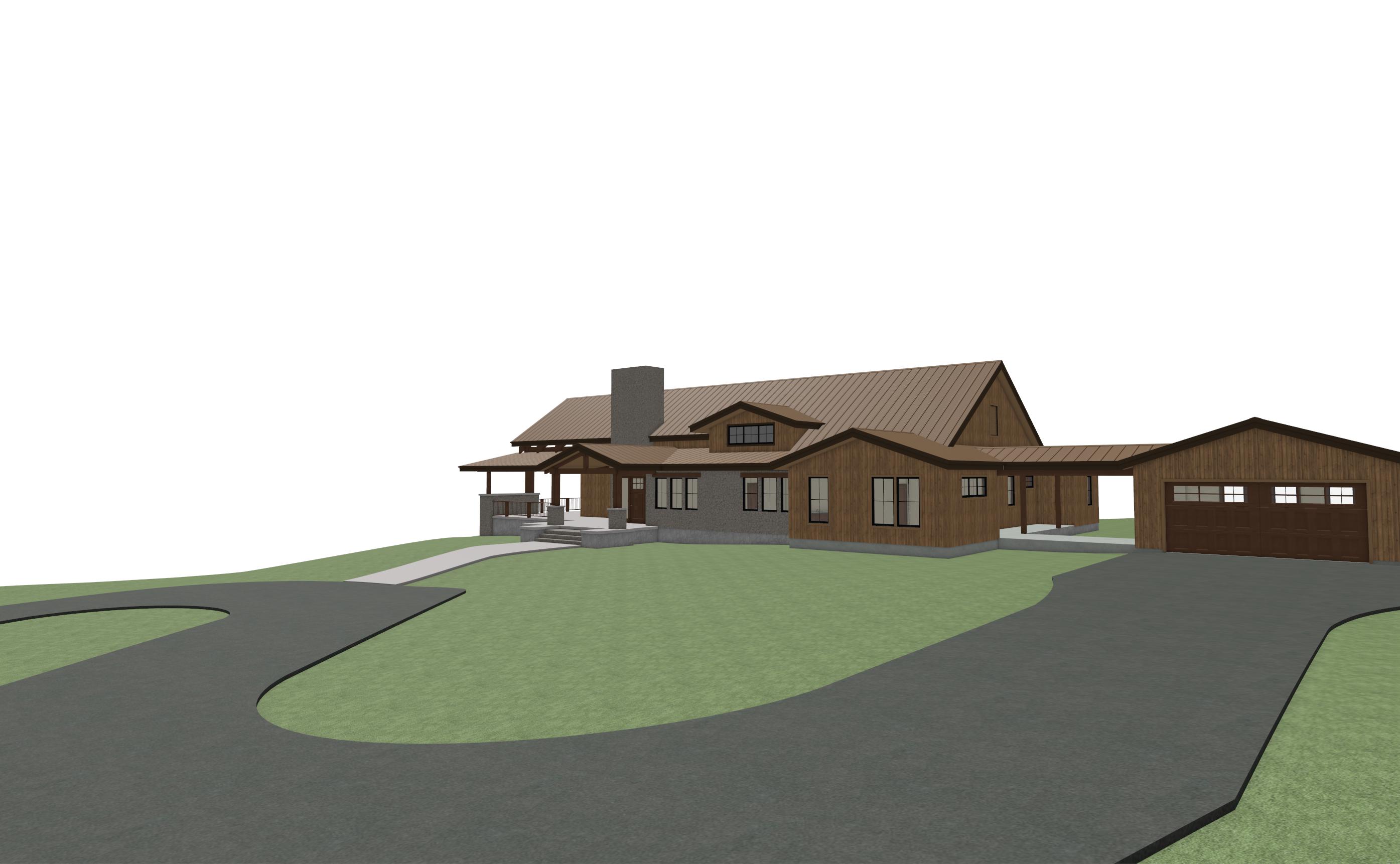 this in montana use native montana trees and vegetation make wood siding ghost wood like jackson hole but leave the rock siding dont change the rock siding just make it more realistic there is rock on the front door entry walls and the walls to the right the wall with 6 windows to the right of the entry has rock make golden hour outside show golden light coming from inside make roof copper standing seam roof make concrete on foundation rock material do not change the shape of the structur or window sizes keep rock on walls and chimney keep driveway the same shape create a realistic elevation of the architectural design maintaining the original materials of lap siding and board and batten in their correct locations enhance the lighting and shadows for a lifelike effect but ensure that the texture and arrangement of both siding types remain exactly as in the original design make sure to keep the rock on the walls the same the background is and open field with montana trees far off in distance the hill slope up slightly to the right and drops off to the left no trees to the left