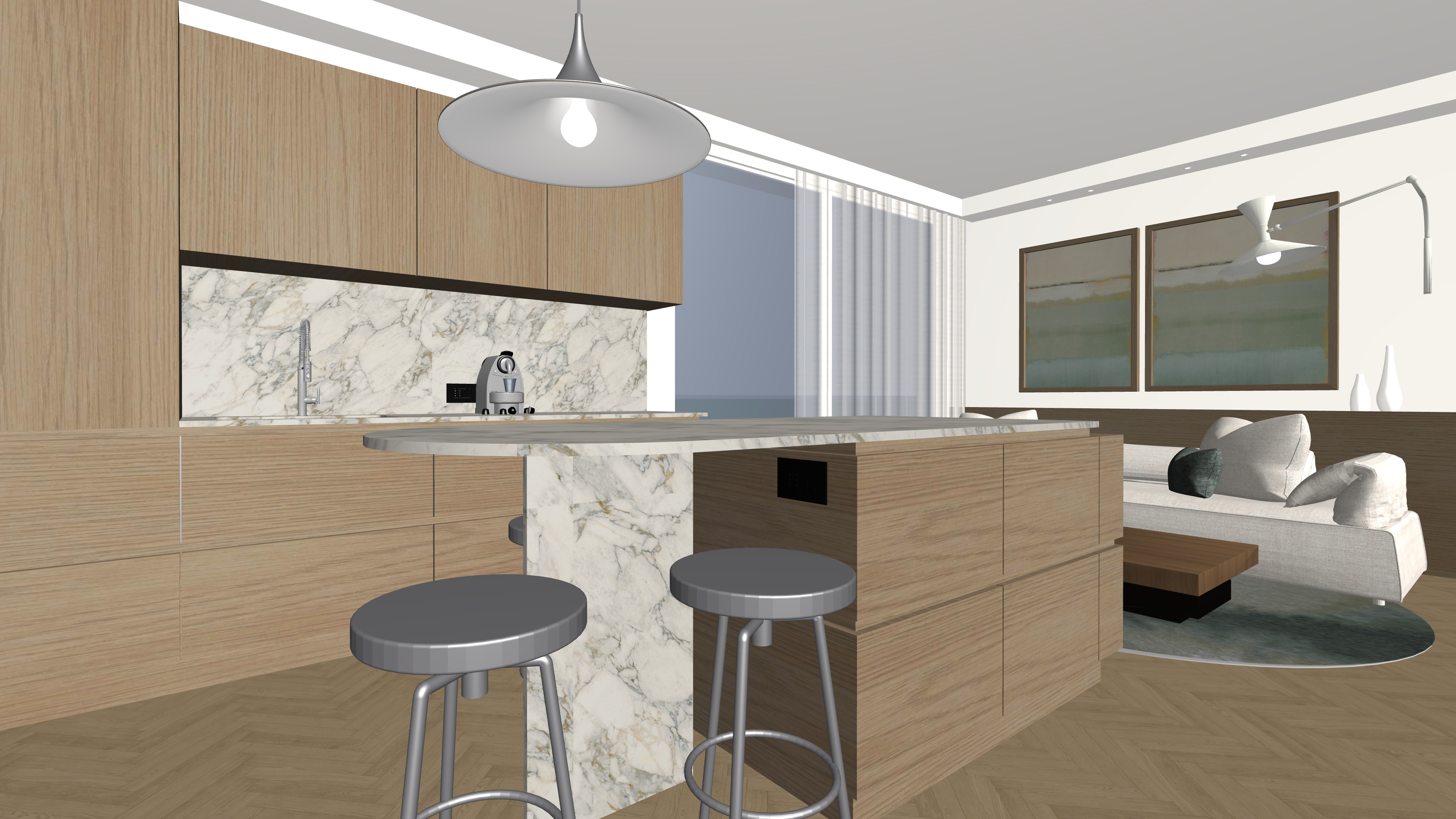 zona cucina con piano in marmo venato e una strip led sotto i pensili l isola della cucina ha una lampada a sospensione cromata ed accesa gli sgabelli sotto all isola sono cromati le pareti sono tinteggiate di bianco sopra al divano abbiamo quattro faretti ad incasso accesi che illuminano i quadri i faretti sono due per ogni quadro a fianco dei quadri abbiamo una lampada a parete bianca accesa dietro al divano la boiserie bassa in legno rovere naturale ha una strip led incassata nella parte superiore che emette luce verso l alto metti una strip led dentro alla veletta della tenda leggera fai entrare un p di luce naturale dalle portafinestre e metti uno parapetto in vetro con solo vista mare in lontananza alle spalle dell immagine c un altra portafinestra che fa entrare della luce naturale e illumina l isola della cucina metti qualche oggetto di una zona cucina
