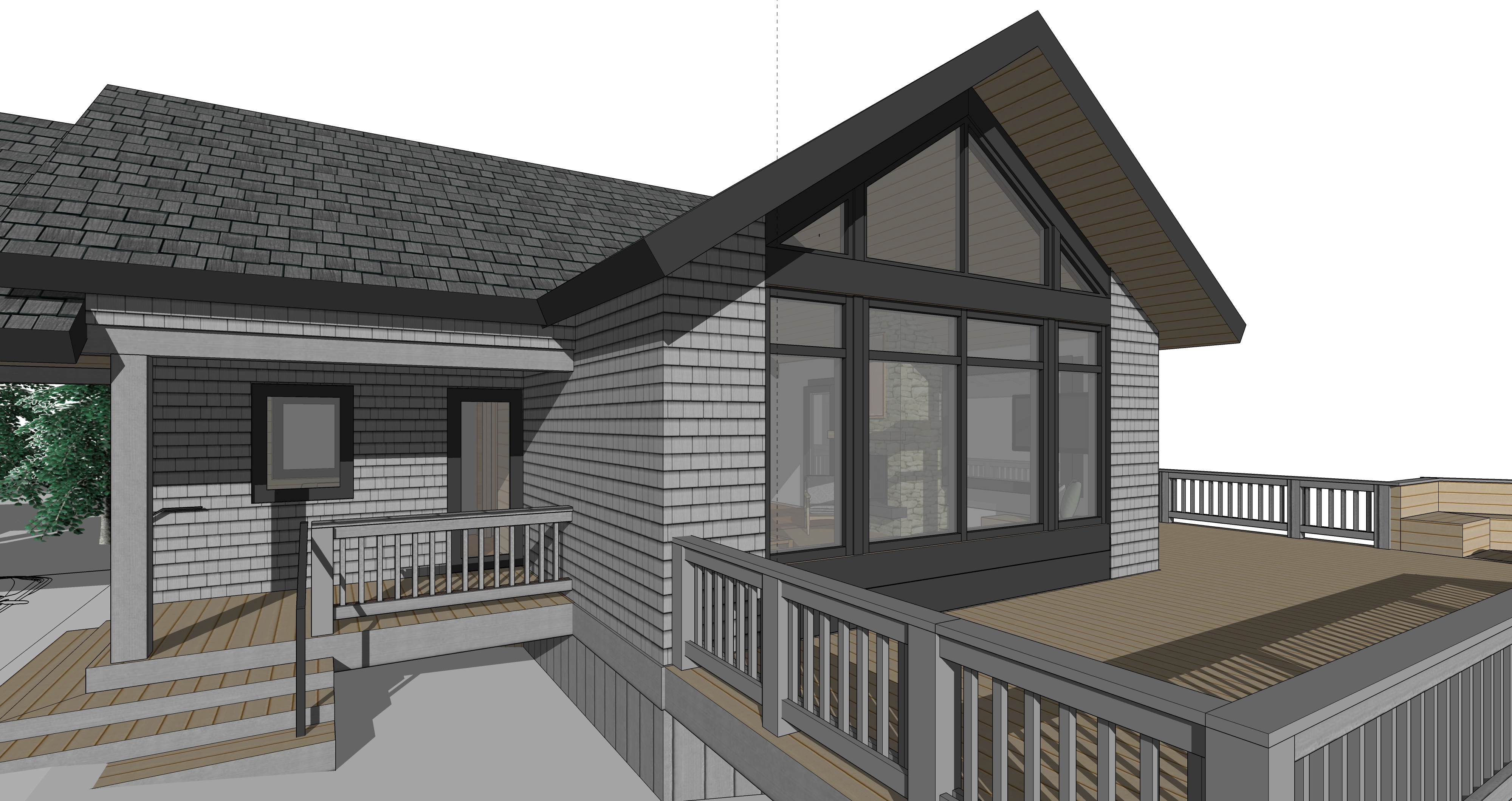 add cedar shake siding add standing seam gray metal roof ipe hardwood deck mountain setting sunny day