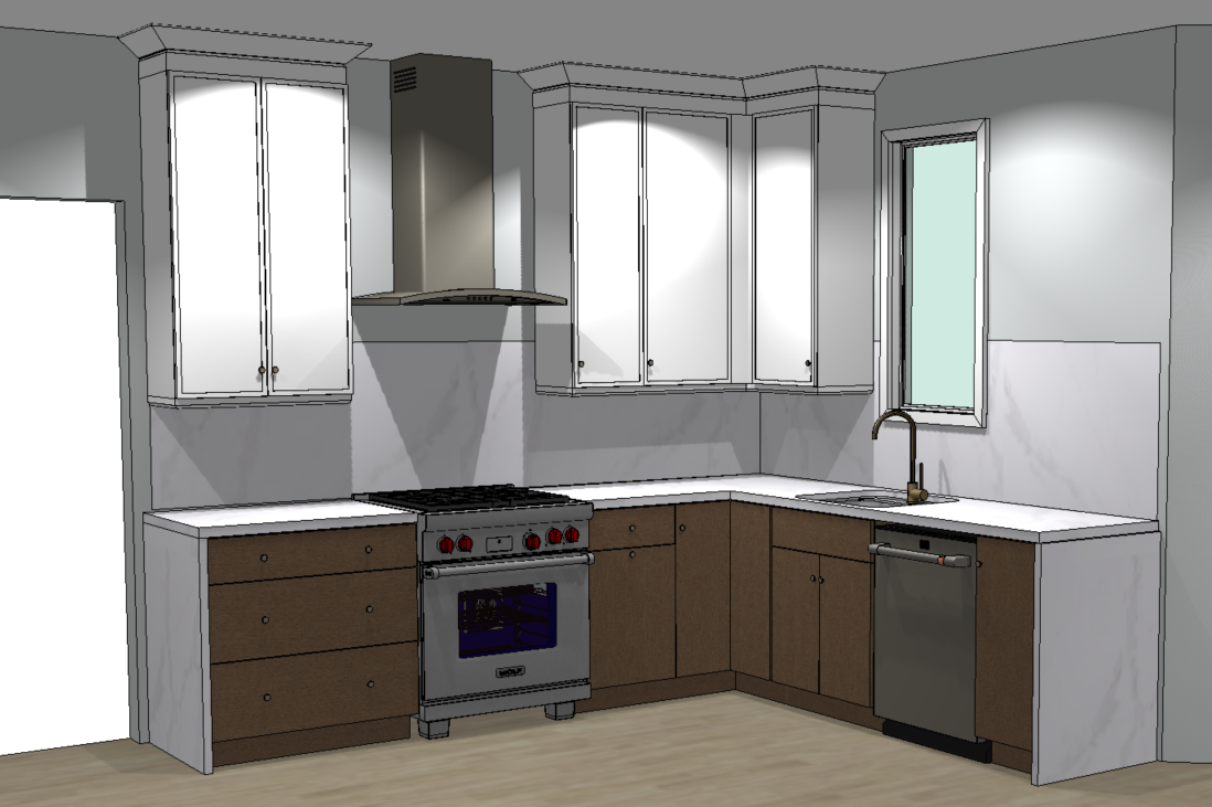 create a realistic and beautifully rendered image of a classic kitchen the wall cabinets are classic white skinny shaker reflecting a soft light the countertops are a polished white marble with subtle gray veining the cabinetry on the bases is finished in a muted maple no grain with warm grey and caramel tones enhanced by under cabinet lighting that casts a gentle glow the range and hood has a sleek stainless steel finish adding a contemporary touch the walls are painted in a soft dove white creating a calm and inviting atmosphere the overall lighting is warm and ambient evoking a cozy and elegant atmosphere
