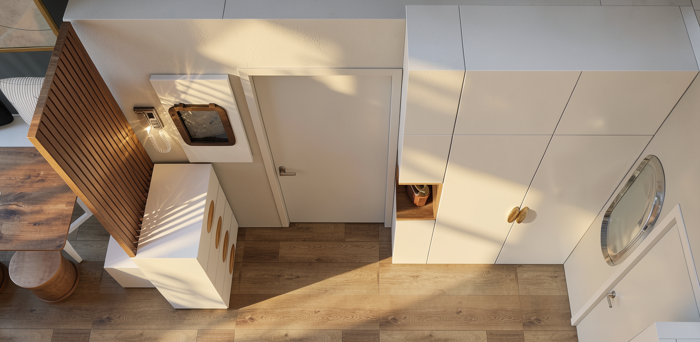 from the following image keep everything same same angle maybe enhance the lighting and shade overall but main thing in the centre where the bord box is add some simple profile moldings and cornice molding like you did for the previous render