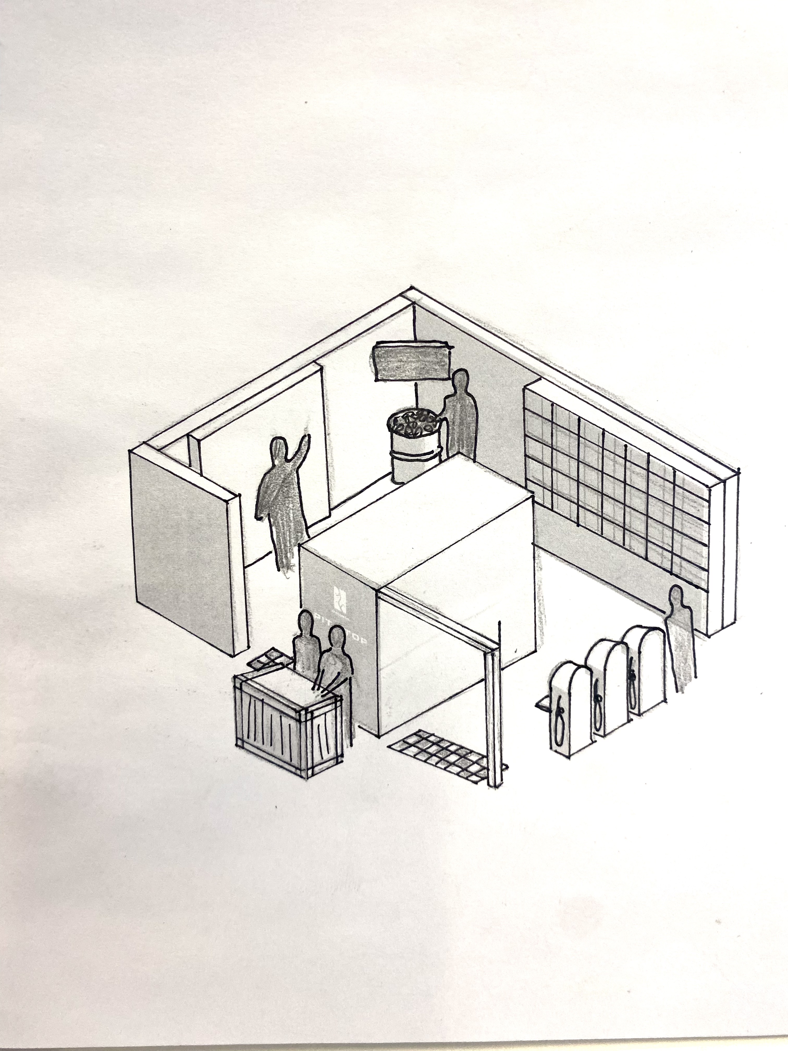 isometric view of a pop up activation use the structure reference provided there are 3 people in the activation and 2 outside at the reception desk