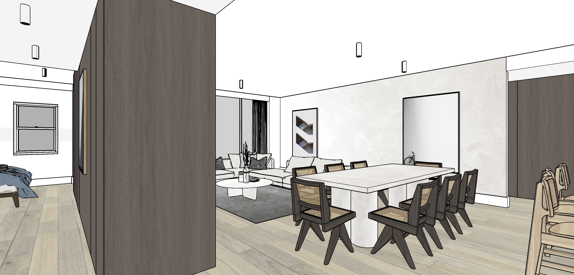render a modern open plan living and dining area with an elegant and cozy atmosphere use warm earth tones for the wooden furniture including the dining table and chairs while incorporating soft whites for the walls to create a clean and airy feel add light oak flooring to enhance the warmth and texture decorate the living area with a plush gray rug and a comfortable sectional sofa in neutral shades include decorative cushions in a mix of charcoal and soft beige frame the wall art in minimalist black frames ensure that the lighting is soft and ambient with modern pendant lights create a harmonious balance of natural textures and modern design downlights only to ceiling except over the dining table i e can light