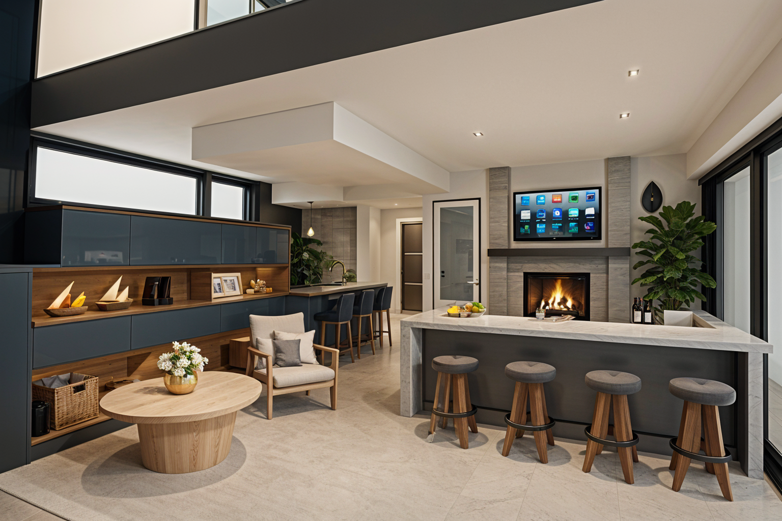 interior shot teal paint is benjamin moore stained glass csp 685 backsplash tile is ames tmlgr815 floor is epoxy concrete image uploaded is a sketchup jpg export create a realistic rendering to show clients the vision maintain the sizing in the jpg fireplace surround has stone masonry columns flanking dekton sandik slab behind tv fireplace mantel is driftwood with epoxy remove blue armchair area rug under sectional is natural jute u shape sectional facing the tv