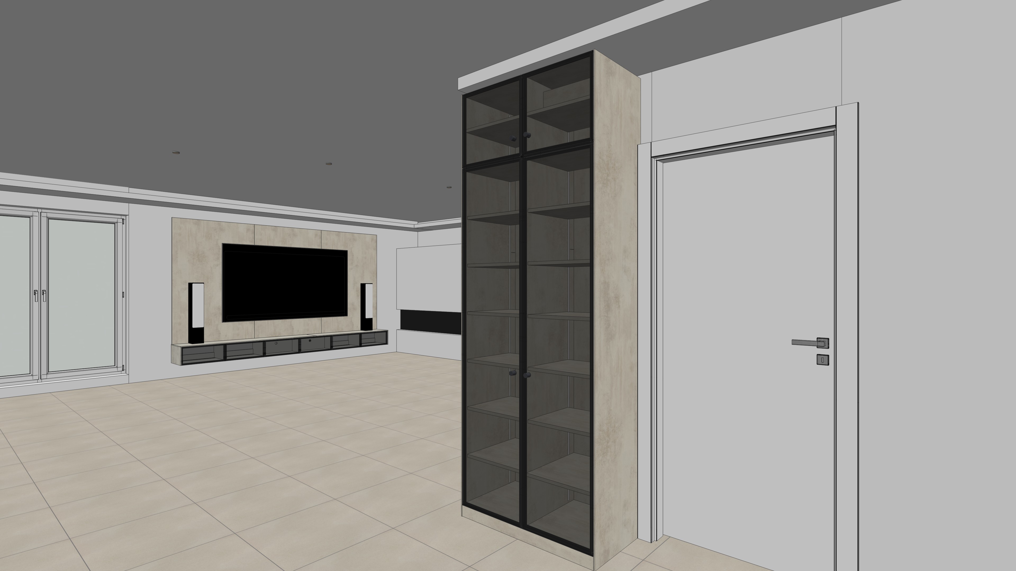 create a render in hyper realistic architectural visualization quality 8k resolution all objects furniture architectural features must remain in place do not add any objects or delete anything from the image the spatial configuration must remain unchanged warmth gentle reflections soft shadows enhanced color richness and luxurious level realism improve depth and realism make a daylight in room the fronts of the cabinets and also the sideboard are parsolglass black the material of the cabinets and the backwall are chipboard egger f637 st10 its important that this decor is kept inside the cabined is led stripe vertical on the left and right side 50mm from the back under the sideboard is also led stripe thats shining on the floor behind the backwall is also led stripe on laft right and on the top and its shinig on the wall