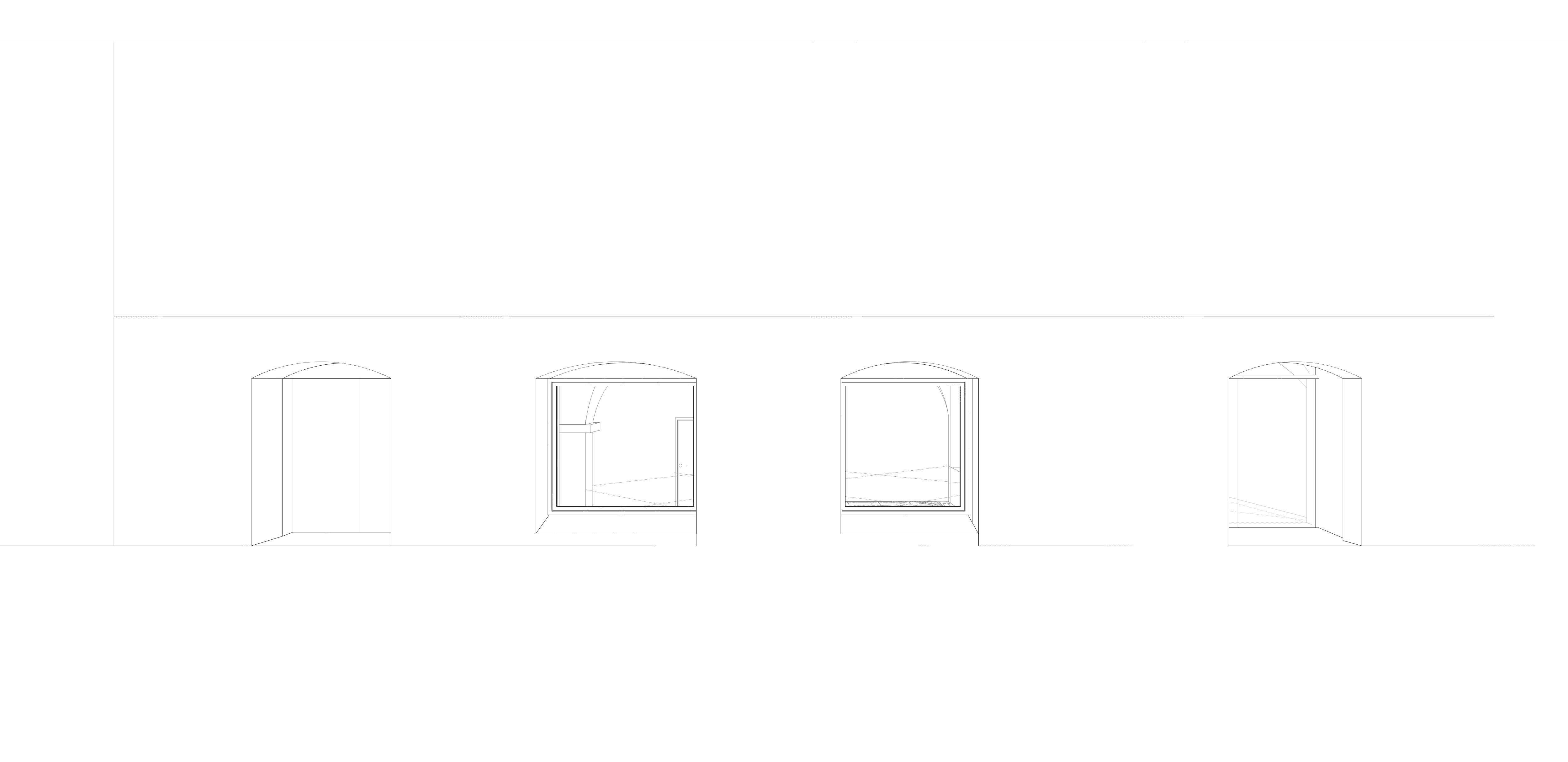 render an architectural illustration featuring a minimalist building facade with four large arched windows enhance the structure with a modern sleek design the building has a smooth white facade the glass windows reflect a soft golden sunlight creating a warm glow capture a serene and sophisticated atmosphere with subtle shadows and highlights the overall ambience should be calm and inviting with a touch of elegance and simplicity