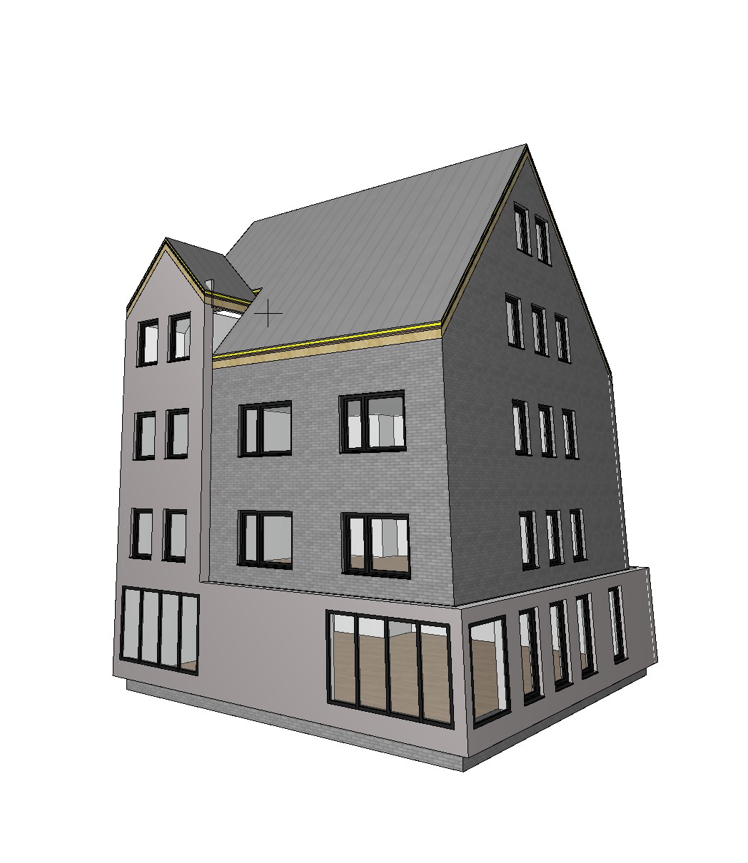 exterior shot render a modern three story building with a gable roof using dark gray slate tiles for the roof the main walls are textured charcoal bricks and the base has a smooth light gray concrete finish frame the windows with sleek black metal set in a serene early morning atmosphere with soft sunlight casting gentle shadows and a clear blue sky in the background