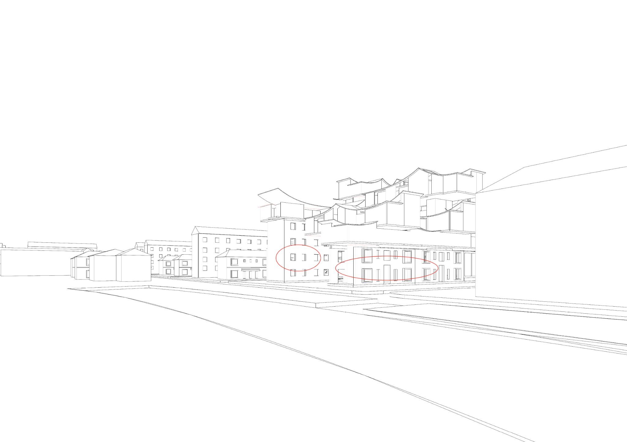 exterior shot transform this architectural line drawing into a realistic colored architectural rendering maintain the exact geometry proportions and perspective of the original drawing the taller wall on the left side circled in red should be red brick material with visible brick texture and natural color variation the lower wall on the right side circled in red should be smooth concrete with a light grey tone and subtle surface texture all other building structures should be warm natural wood material with visible wood grain and a soft matte finish keep the traditional chinese inspired roof forms use soft natural daylight realistic shadows and a calm architectural atmosphere high resolution photorealistic architectural visualization clean material expression no change to building form