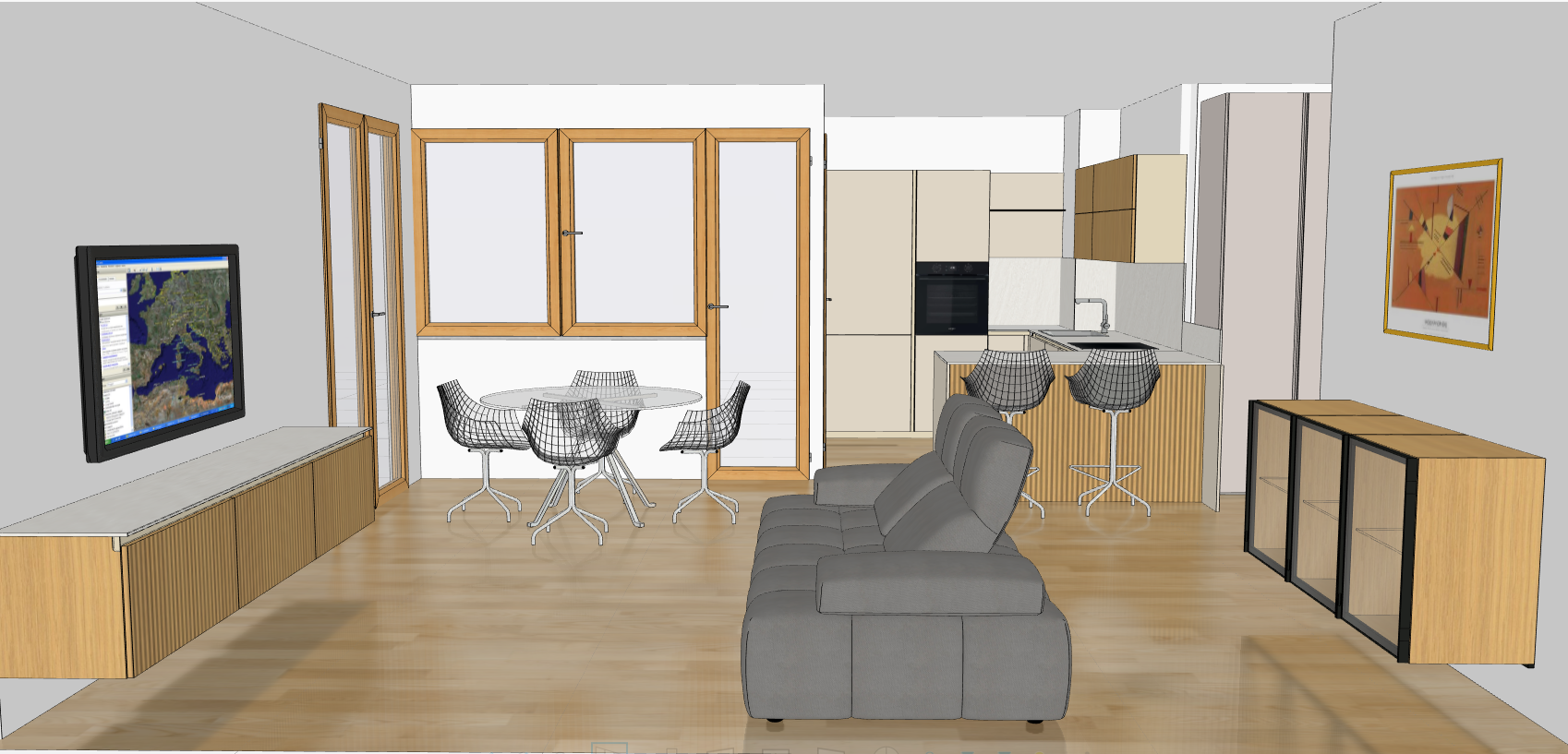 ultra photorealistic interior render based on the provided image preserve exactly the original kitchen layout furniture proportions wall positions camera angle and architectural openings important architectural constraint there is a solid wall below the central window the window must remain a standard window with a wall underneath do not transform the window into a full height glass door or floor to ceiling opening maintain the lower wall portion exactly as in the original reference image do not modify cabinet colors countertop material flooring tone window and door frames furniture dimensions or layout materials maintain all materials identical to the original reference image enhance realism only by improving texture quality all wooden cabinet elements must show a subtle realistic fluted wood cannettato effect with vertical grooves exterior view add a realistic outdoor landscape visible only through the existing windows and doors soft greenery and distant sky maintain original opening proportions lighting warm natural daylight entering from the windows late afternoon soft golden tone balanced global illumination soft realistic shadows no harsh contrast or overexposure styling add tasteful minimal decor on the dining table ceramic vases or a bowl elegant contemporary composition rendering style high end architectural photography look photorealistic materials sharp details natural color grading no architectural or layout modifications