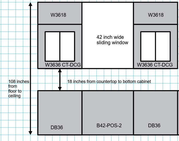 create a realistic kitchen cabinet rendering using the following specs luxor shaker cabinets misty gray color wall from left to right w3636 ct dcg 36 high 2 door wall cabinet with clear glass with w3618 18 high wall cabinet stacked above it center 42 sliding window w3636 ct dcg 36 high 2 door wall cabinet with clear glass with w3618 18 high wall cabinet stacked above it backsplash and countertop quartz continuous slab from countertop to backsplash 18 inches from bottom of cabinet to countertop material is msi calacatta laza grigio base cabinets from left to right db36 3 drawer base cabinet b42 pos 2 2 drawer 2 door base cabinet w 2 pull out shelves db36 3 drawer base cabinet