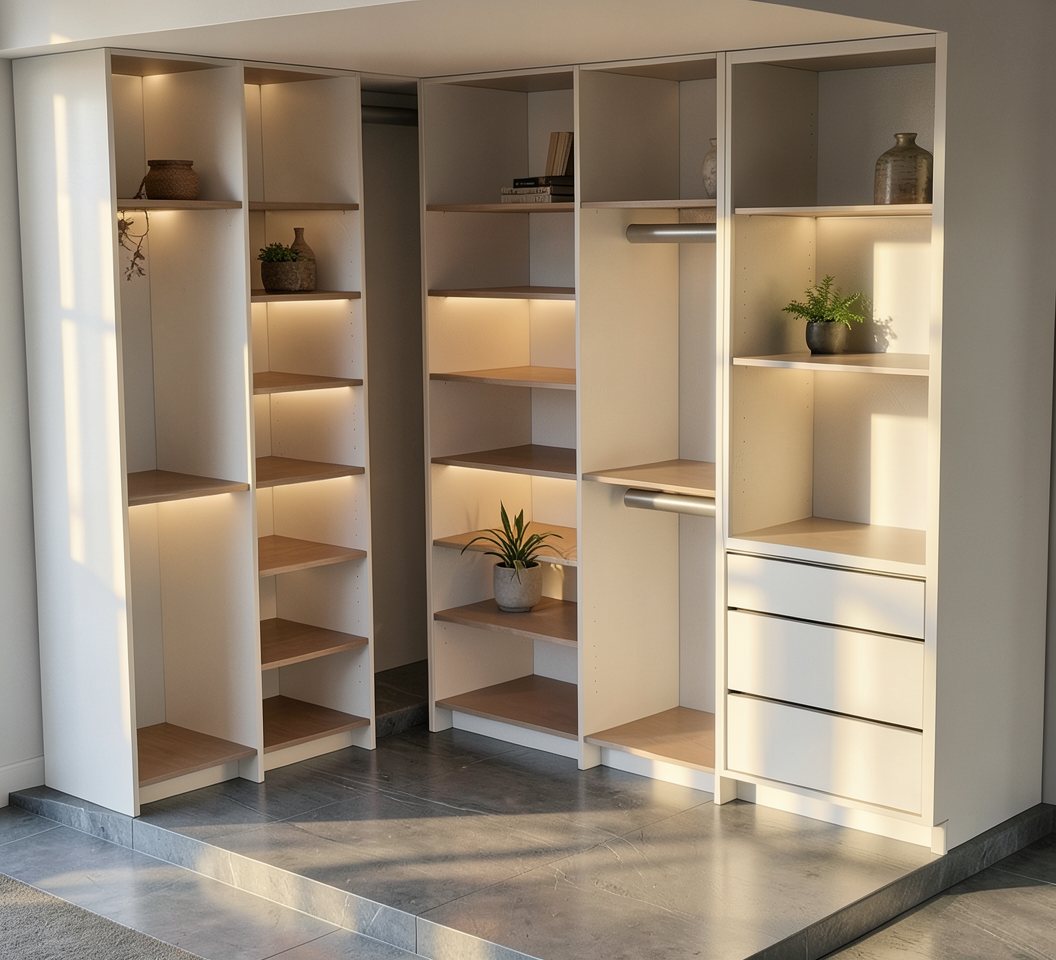 make the shower tile off white ceramic with white marble flooring and countertop and white oak vanity without hardware and make the fixtures unlacquered brass
