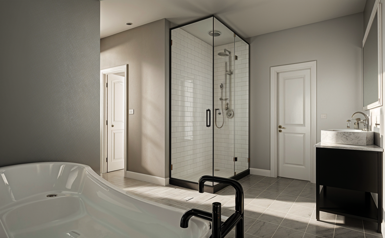 gray siding walls and white trim side driveway is pervious concrete wooden fence big tress on both sides that cover the neighboring building make chimney white brick bright soft afternoon natural light ultra detailed