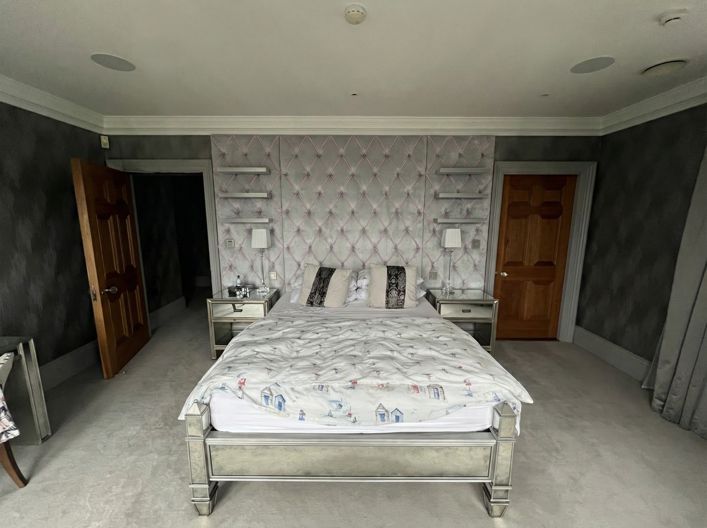 luxury campervan interior bedroom make three changes 1 padding extension continue the existing light grey velvet deep buttoned diamond tufted padding so it wraps and continues across the top of both door architraves door frames running as a padded valance pelmet strip across the top of each wooden door frame with matching pink stitching seamlessly connecting to the main padded wall panel 2 wallpaper replace the dark grey textured walls on the left and right side walls with omexco joy 43 wallpaper in pink this is an organic tactile pebbled dotted botanical texture wallcovering in a warm dusty rose pink colour with an irregular raised dot pattern giving a natural stone or coral like surface texture apply it to all non padded wall areas 3 lamps replace both bedside table lamps with the porta romana duck feet lamp these are iconic surrealist table lamps with elongated cast brass bird duck leg bases two thin articulated legs with splayed duck feet supporting a large cylindrical drum lampshade in natural linen place one on each bedside table keep all other elements exactly the same