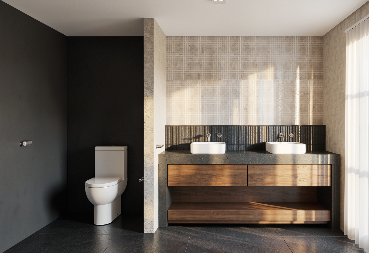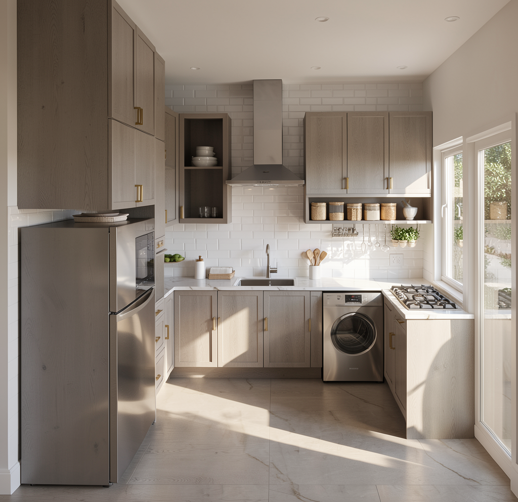 warm kitchen with a lighter grey oak white marble countertops more glossy white brick wall and no errors do not add rug there will be hood above the water tap but no need to be too obvious image must be16 9 aspect ratio on a sunny day make sure that the dish washer must be obvious no need to reflective on cabinet panels remove the board beside of the refrigerator change washing machine to dish washer do not forget to add gas strove