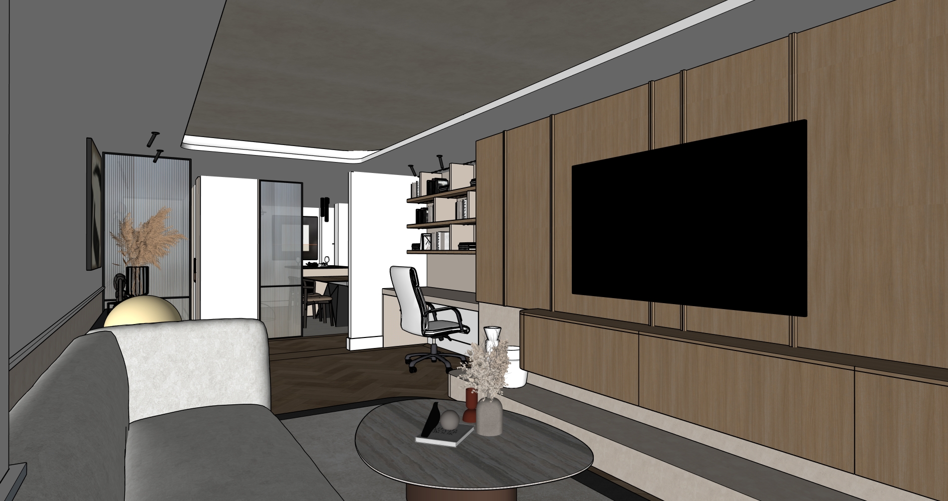 crea una imagen fotorealista a partir de esta de sketchup realza las texturas e iluminacion para que queda todo natural y realista a ade ilimunacion en el foseado del techo no tantas luces y sombras la madera del mueble tv es un poquito mas oscura