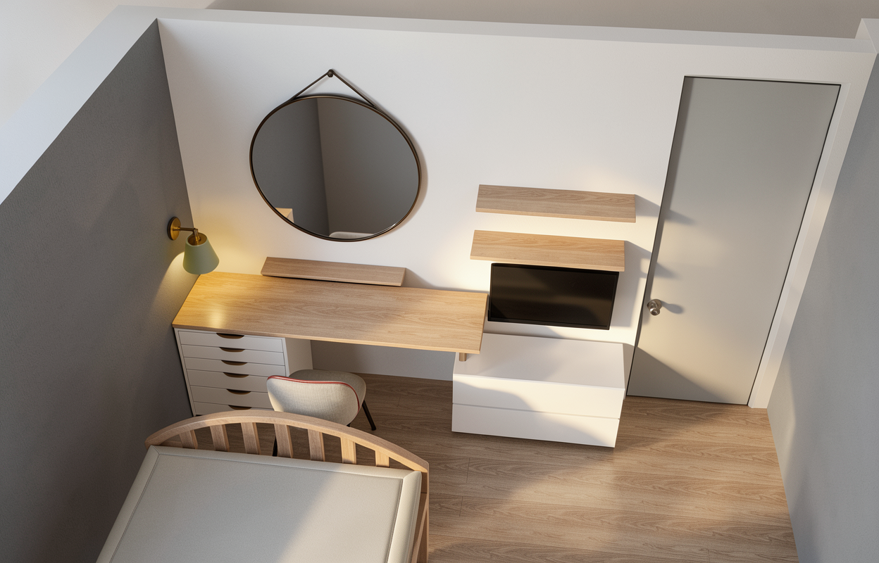 enhance the realism of this architectural visualization while strictly preserving the original geometry volumes proportions and composition dont change any shapes layout camera angle or perspective improve material realism with physically accurate textures pbr add realistic lighting with natural global illumination soft shadows ambient occlusion and accurate reflections refractions slight atmospheric depth and realistic color grading maintain the original framing and scene structure exactly as is focus on photorealism high dynamic range and cinematic quality without modifying the design