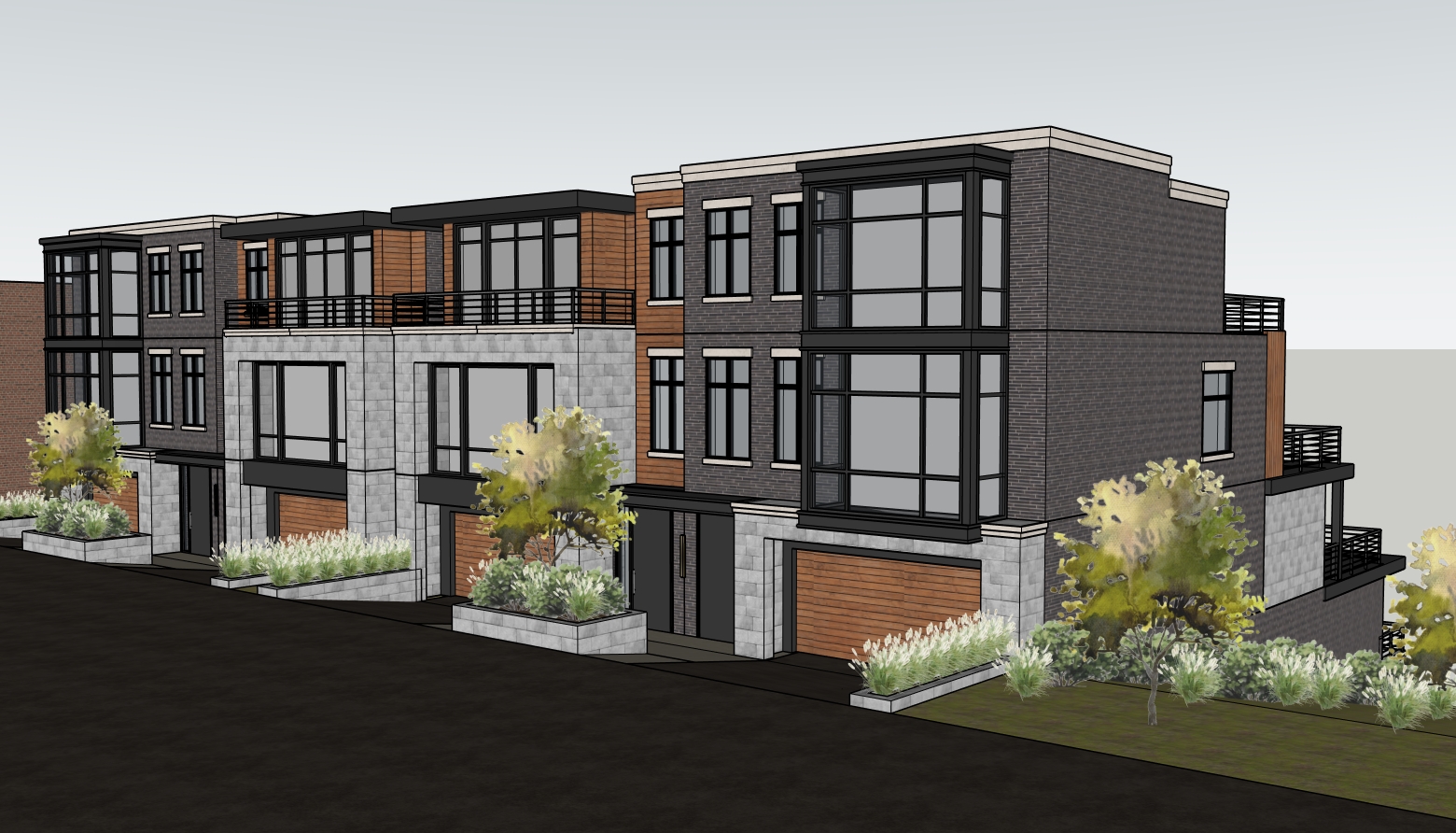 ultra photorealistic architectural rendering in a cinematic real time visualization style unreal engine d5 render quality late morning daylight with slightly angled sun creating soft defined shadows balanced exposure with no blown highlights low bloom and controlled dynamic range warm neutral color grading with subtle warm highlights and neutral shadows no blue tint natural material response with warm light reflecting off wood and ground surfaces slight contrast boost with clean crisp edges and subtle ambient occlusion clear atmosphere with no fog or haze but natural depth created through slight background softening and contrast falloff foreground and main subject remain sharp and detailed minimal curated landscaping with natural but slightly desaturated greenery no overgrown vegetation cinematic composition realistic sky with soft blue tones and light clouds professional architectural visualization style sharp focus 8k resolution lit and fully furnished interiors behind windows road with driveways to garages in foreground on a hill looking out over the city of cincinnati ohio in the background