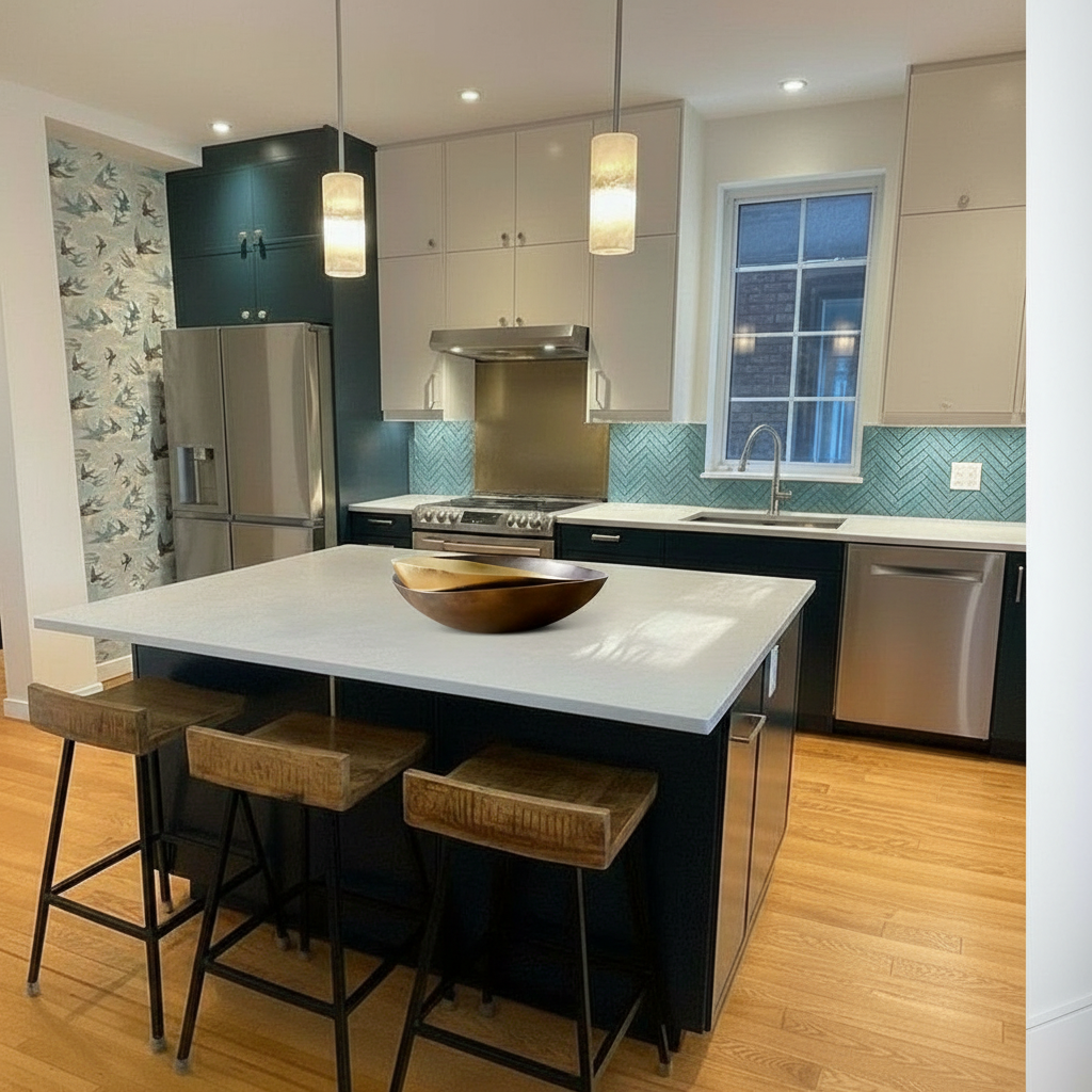 can you please make the bowl on the island a bit smaller and move it more to the left and remove the white outlet on the blue backsplash maintain image