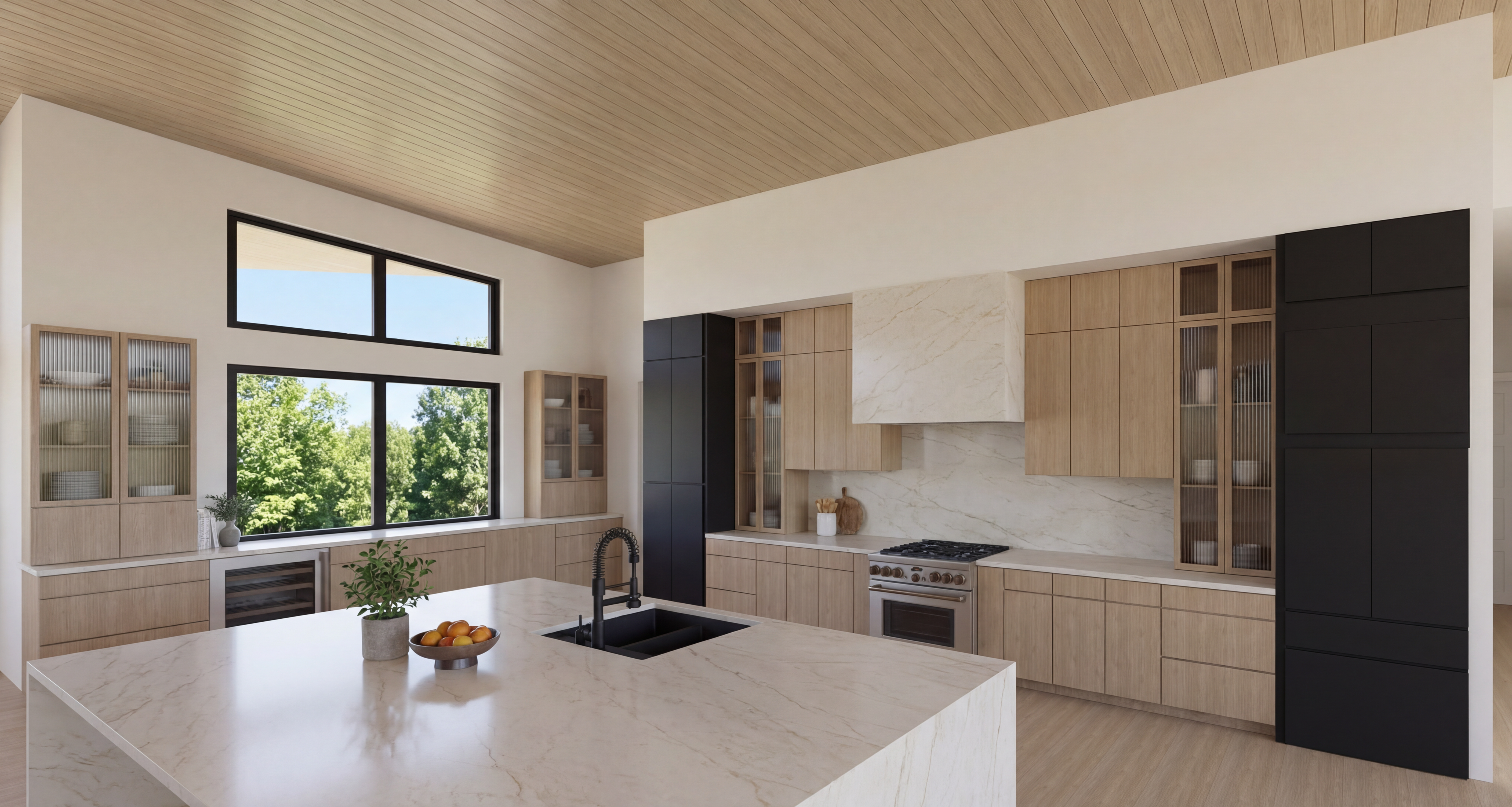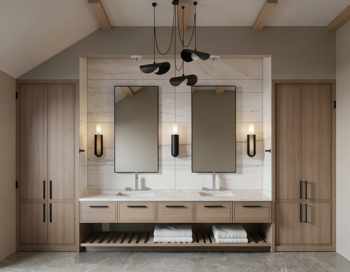 overarching principles generate a photorealistic cinematic quality 3d interior elevation that strictly adheres to these specifications maintain all scale and proportions from the original sketch but incorporate all the following design refinements for an elevated spa like luxurious minimalist and cozy aesthetic i critical architectural elements no deviations ceiling structure the ceiling must retain its original asymmetrical sloped vaulted shape that visibly drops down on the left side this is a fixed architectural feature ceiling wall paint the entire ceiling including all sloped vaulted and flat sections and both side walls must be painted a uniform soft warm taupe color this taupe should be less khaki and match the softer tone previously discussed exposed beams there must be 5 five equally spaced exposed wood beams running across the sloped ceiling these beams must be the exact same warm medium oak wood color and finish as the vanity and tall cabinets no skylight ensure there is absolutely no skylight ii millwork alcove vanity precise construction framing alcove create a perfectly symmetrical millwork alcove that frames the vanity area tall linen cabinets two tall 16 deep medium oak wood linen cabinets flat panel doors matte black slim hardware are positioned at either end their side panels and reveals must also be the matching warm medium oak wood soffit bridge a solid continuous horizontal soffit must bridge directly and precisely between the tops of these two tall cabinets this soffit must be painted the same soft warm taupe as the walls and ceiling open space above soffit the wall space above this taupe soffit must remain entirely open allowing the original asymmetrical sloped ceiling and all 5 exposed beams to be fully visible and integrated into the design vanity type a 22 deep extruding 6 past the 16 deep tall cabinets floating vanity constructed from warm medium oak wood with matte black slim hardware the vanity top height is 34 above the finished floor vanity storage option c spa style top row exactly 6 six deep flat panel drawers across the entire width of the vanity each drawer face must represent a single deep storage unit avoiding visual stacking of shallow drawer faces lower shelf directly beneath these drawers a matching medium oak open slatted shelf runs the full width of the vanity this shelf is intended for curated display e g neatly folded towels vanity apron the vanity must feature a 10 high waterfall stone apron this means the countertop material dolomite extends vertically down 10 at the front of the vanity forming the apron not a wood panel toe kick a 4 high recessed toe kick is placed beneath the vanity with a standard recessed profile that creates appropriate shadowing to maintain the floating effect iii backsplash surface materials accurate representation backsplash stone the backsplash must be dolomite stone tiles dolomite color the dolomite must be a soft muted white with a cool neutral undertone not stark bright white not yellow and not overly grey speckled it should have subtle natural veining tile dimensions orientation the dolomite tiles are precisely 24 x 48 and must be laid in a vertical stack pattern with visible grout joints not horizontal iv fixtures lighting as specified mirrors pill shaped two tall pill shaped mirrors explicitly rounded at both the top and the bottom are required with very thin matte black frames these are centered above each sink wall sconces the exact matte black wall sconce from the original sketch must be used do not change its form proportion mounting height finish must be solid matte black or placement on the stone backsplash between and outside the mirrors pendant light minimalist a minimalist airy matte black linear pendant light a simple thin bar or intersecting bars distinctly different from the original multi arm pendant is suspended high up near the beams ensure it does not visually overlap or compete with the mirrors or sconces recessed soffit lights small 4 aperture recessed downlights are evenly spaced within the taupe soffit above the vanity faucets slim chrome single handle faucets lighting ambiance warm 2700k accent lighting from sconces pendant and recessed soffit downlights balanced with ambient room light v camera composition rendering high fidelity camera angle straight on elevation view aspect ratio 16 9 resolution high resolution e g 4000px wide floor visibility the camera crop is lowered approx 6 8 lower than the previous rendering to show significantly more of the warm grey large format floor tiles ensuring their pattern texture and grout lines are clearly visible in the foreground rendering quality cinematic photoreal quality with realistic global illumination physically accurate reflections correct material roughness and bump maps visible wood grain honed stone texture metal finishes subtle ambient occlusion and crisp accurate shadows especially under the floating vanity and toe kick fine details include visible drawer seams eased countertop edge realistic grout beveled junctions and slight material imperfections for ultimate realism