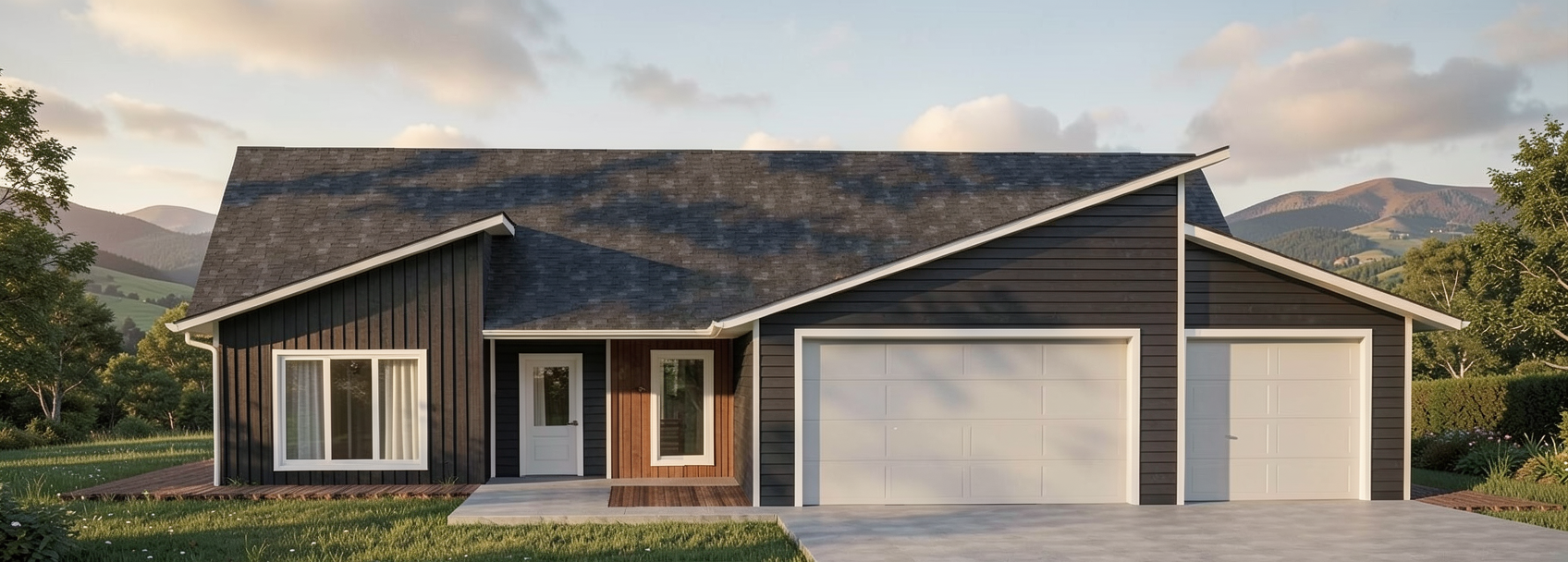 keep the original architecture exactly the same very important main roof must be dark charcoal shingles only no metal on the main roof garage canopy must be a small black standing seam metal roof above the garage door only entry canopy must be a small black standing seam metal roof above the entry only no metal roof over any other part of the house materials add a full height light beige limestone entry surround at the front door only add a stone arch at the front door only do not add stone anywhere else on the house no stone at the garage no stone on the lower facade at the garage vertical narrow dark grey brown wood siding on all main wall surfaces windows keep all windows exactly the same black frames slightly reflective glass no interior visible rendering soft golden hour daylight photorealistic materials keep everything else unchanged do not redesign the house preserve all original roof shapes all original small roofs and all original facade proportions
