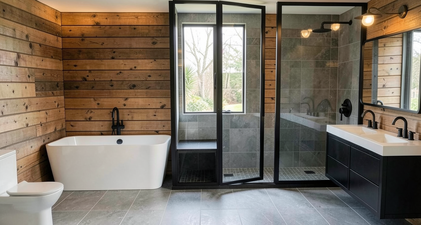 add modern light wood shiplap to walls add grey tile to shower and floor