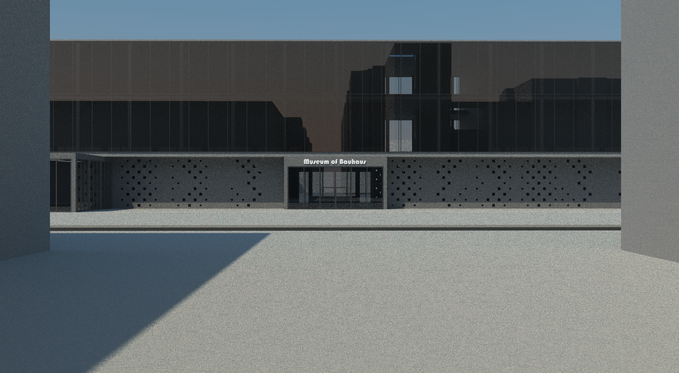 modernist exterior shot render a modern bauhaus museum with a minimalist design the building features sleek black glass with geometric patterns use deep charcoal gray for the walls contrasting with the soft pastel blue sky the entrance has a welcoming appearance with a touch of white text above the doorway create a cool and calm atmosphere highlighting the simplicity and elegance of the architecture the ground should be a smooth light gray with subtle shadows adding depth and realism architecture