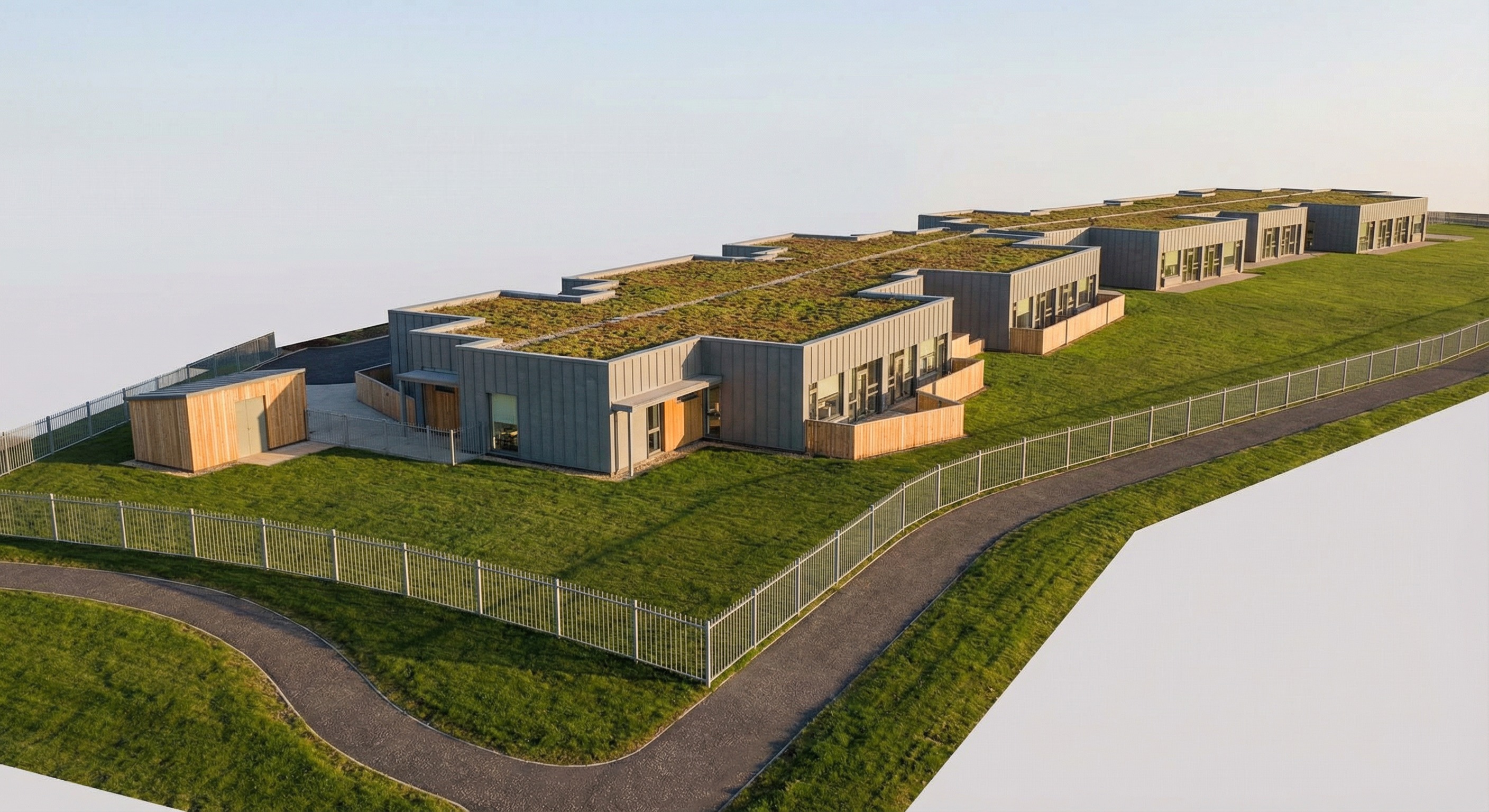 remove fence closest to camera add preschool playground on the exterior area but keep rest of fence