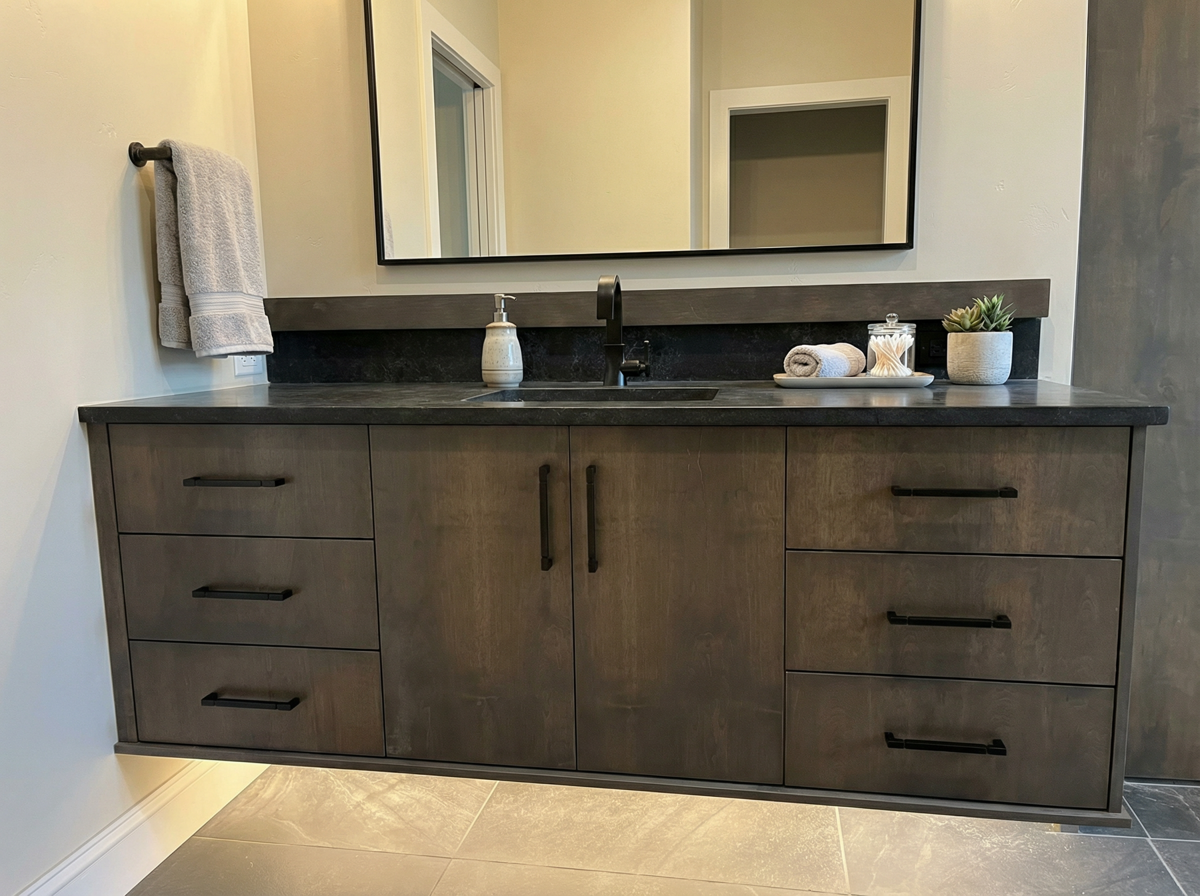 white buildings dark brown stone wall forefront grey windows red brick chimney