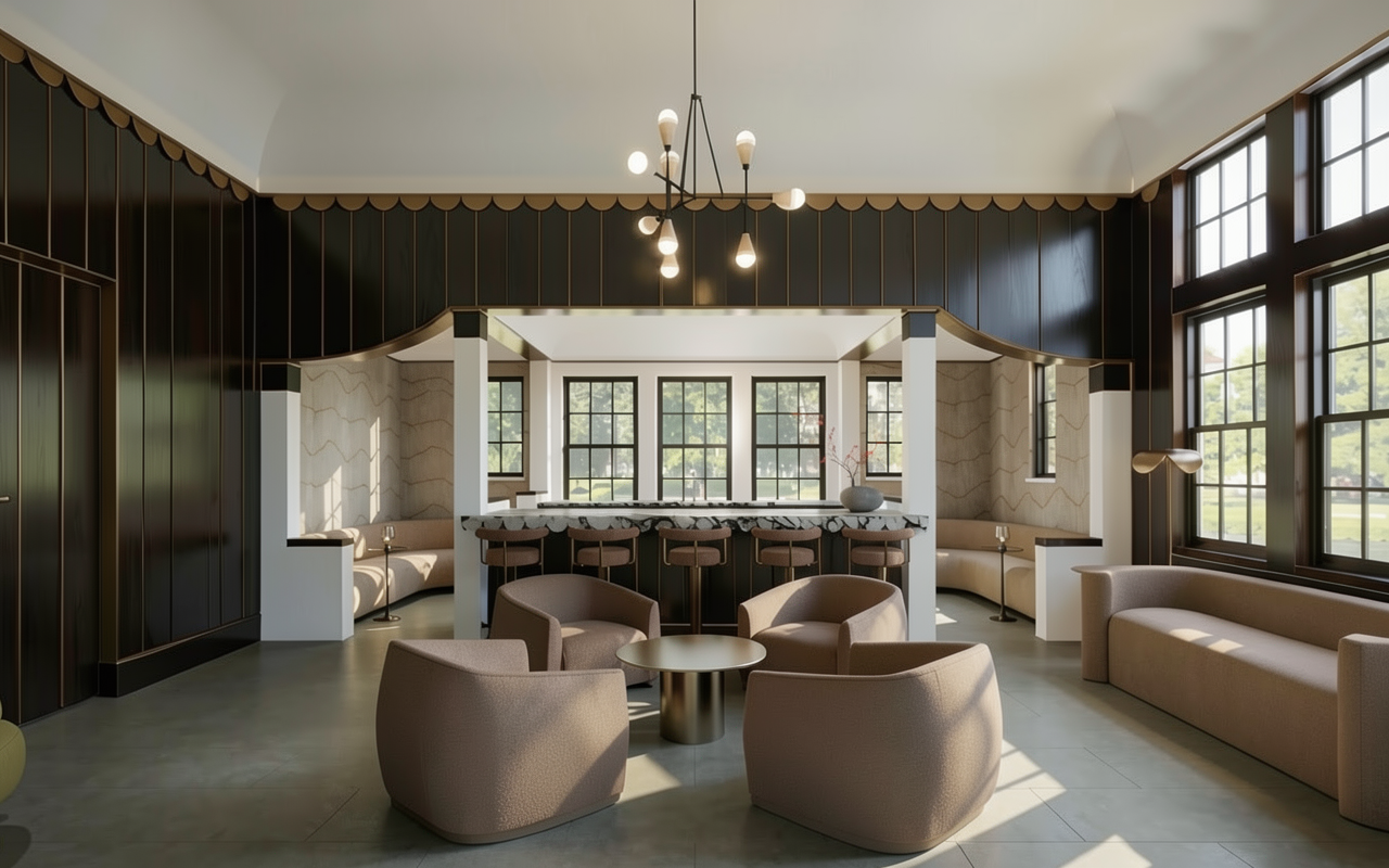 change the 4 chairs in the center to have a dark blue grey color in suede fabric