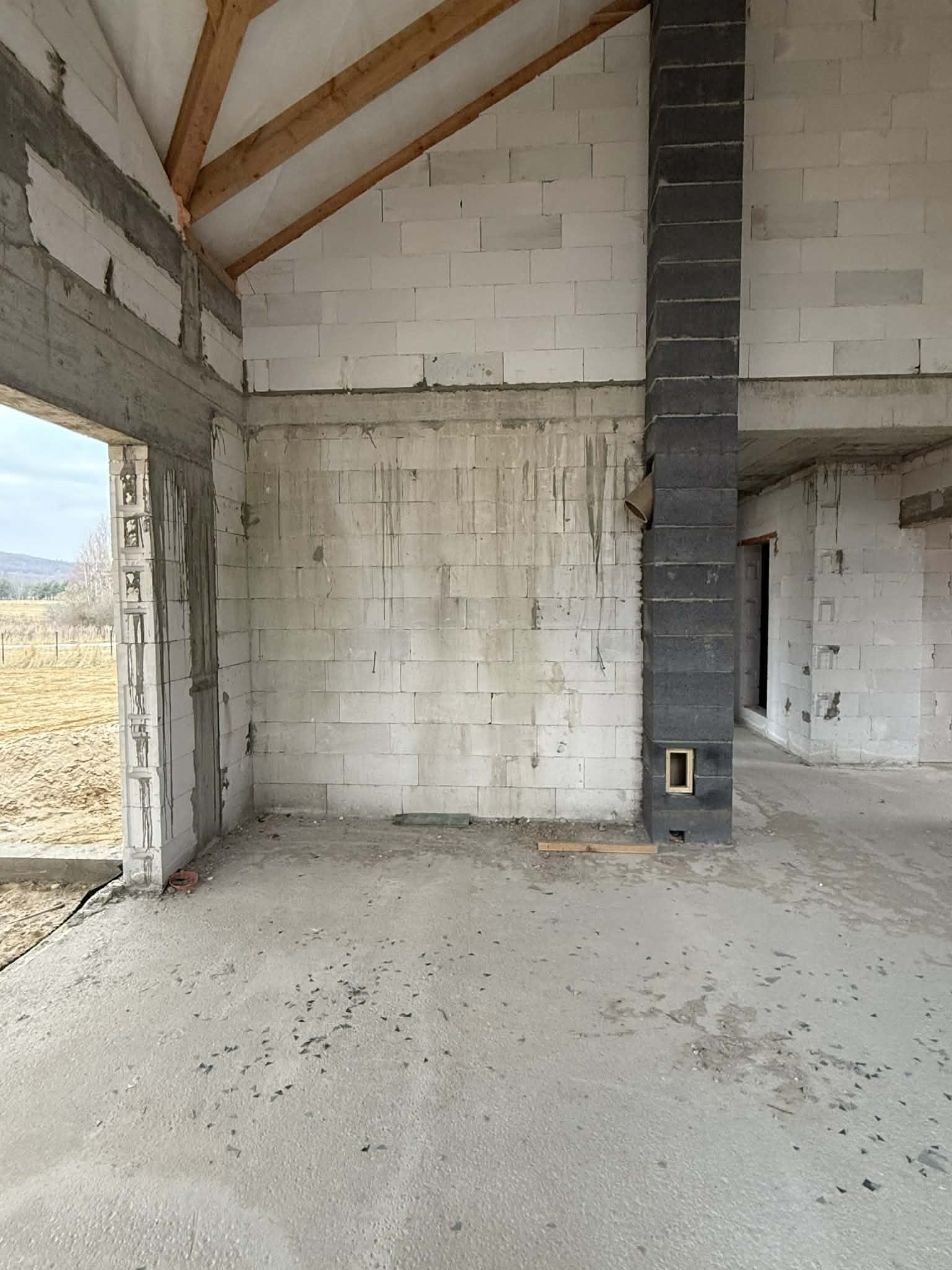 modernist render a beautifully renovated modern interior of the unfinished space transforming it into a cozy minimalist living room use soft cream and white tones for walls and ceiling adding warmth with light oak wooden beams replace the concrete chimney with a sleek matte black finish to add contrast install a large window on the left allowing natural light to flood in and visualize a serene countryside view with soft green and blue hues add a plush gray area rug on polished wooden floors and a comfortable light gray sofa in the center include subtle decorative elements like indoor plants and soft golden lighting fixtures to create a warm and inviting atmosphere architecture