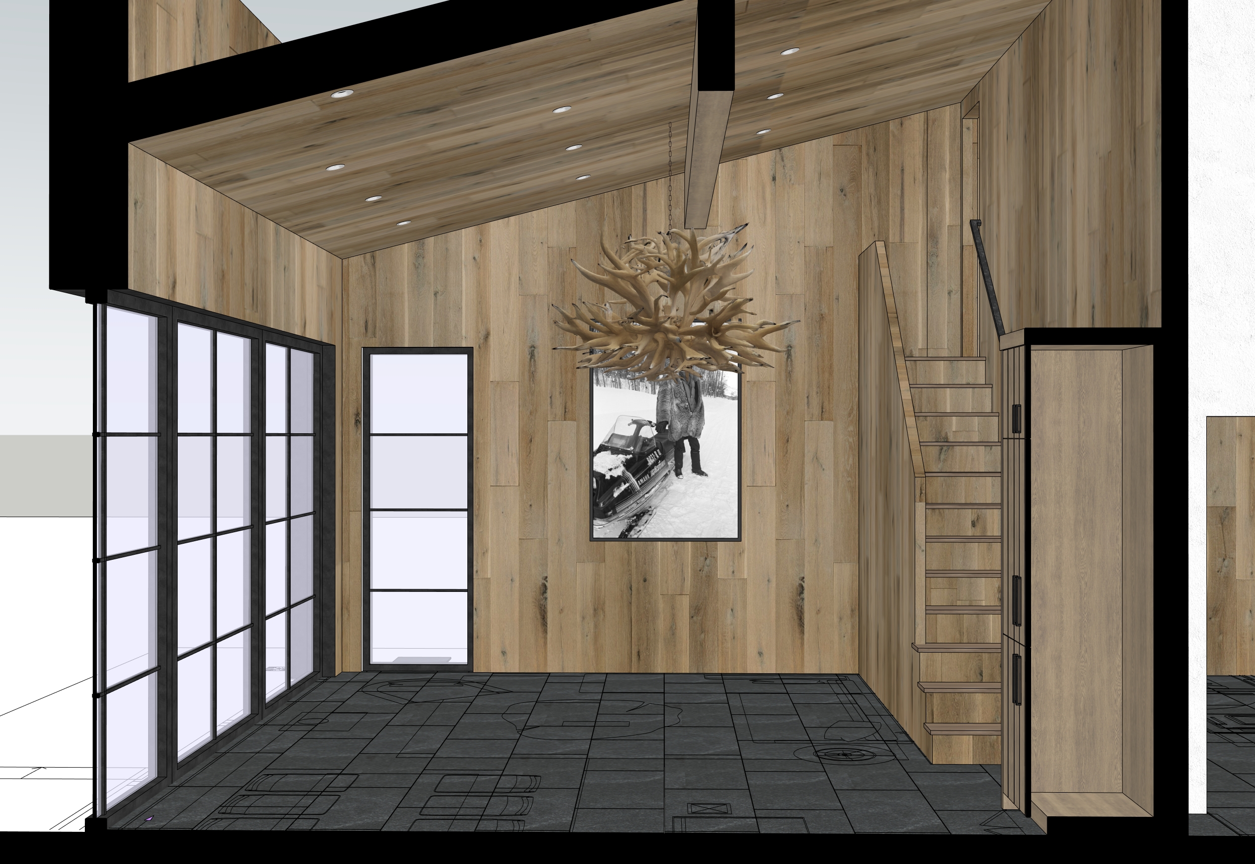 keep all of the items and materials the same in this interior mountain rendering of a cabin do not add any furniture or anything extra the flooring is a dark stone material