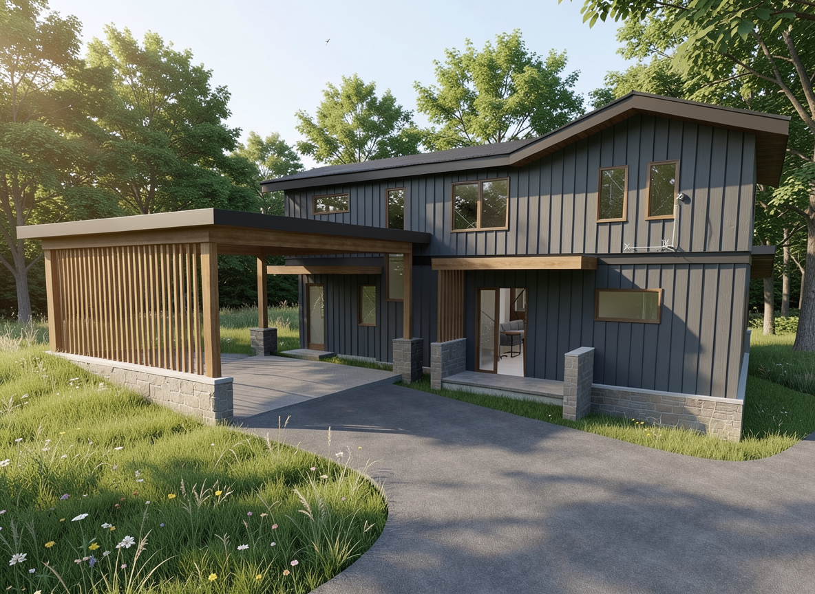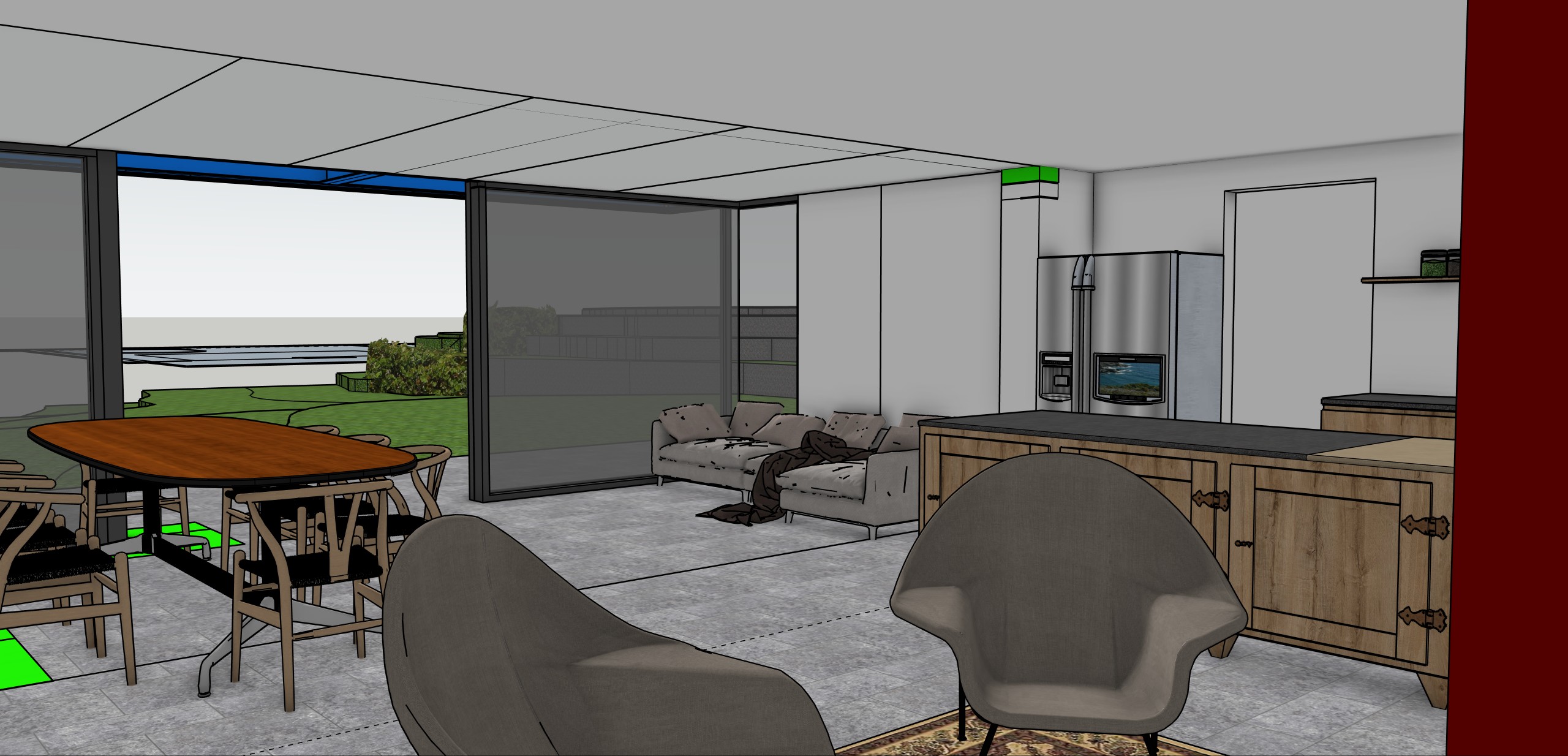 create a modern elegant living space with large glass windows overlooking a lush green lawn landscape and then out to sea the atmosphere is cozy and inviting with a warm natural light filling the room the sofa is a soft gray with plush texture complementing the sleek stainless steel of the refrigerator the dining table is a rich walnut brown with matching wooden chairs that have comfortable dark cushions the kitchen cabinets are a light maple wood with subtle grain patterns the flooring is a polished marble in light gray hues enhancing the room s sophisticated ambiance