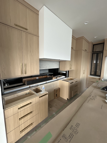 do not change the cabinets at all preserve the exact cabinet colors materials finishes door style drawer style hardware proportions reveals geometry and alignment exactly as shown do not alter the countertop flooring walls ceiling angles perspective lighting direction appliances or any architectural elements keep the camera viewpoint absolutely identical only remove clutter construction materials and unfinished areas clean the room and make it look fully finished add only minimal tasteful staging items appropriate for the space do not add any furniture or change anything about the cabinets countertop or room structure no cabinet changes no perspective changes no angle changes no color changes no resizing no shape changes no geometry changes no filler changes no hardware changes no new cabinetry no wall changes no added shadows that distort structure add a 48 slide in range below the hood to fit the opening add countertops to the base cabinets stage as a kitchen do not add or change anything else about the cabinets do not add more cabinets the layout must stay as is