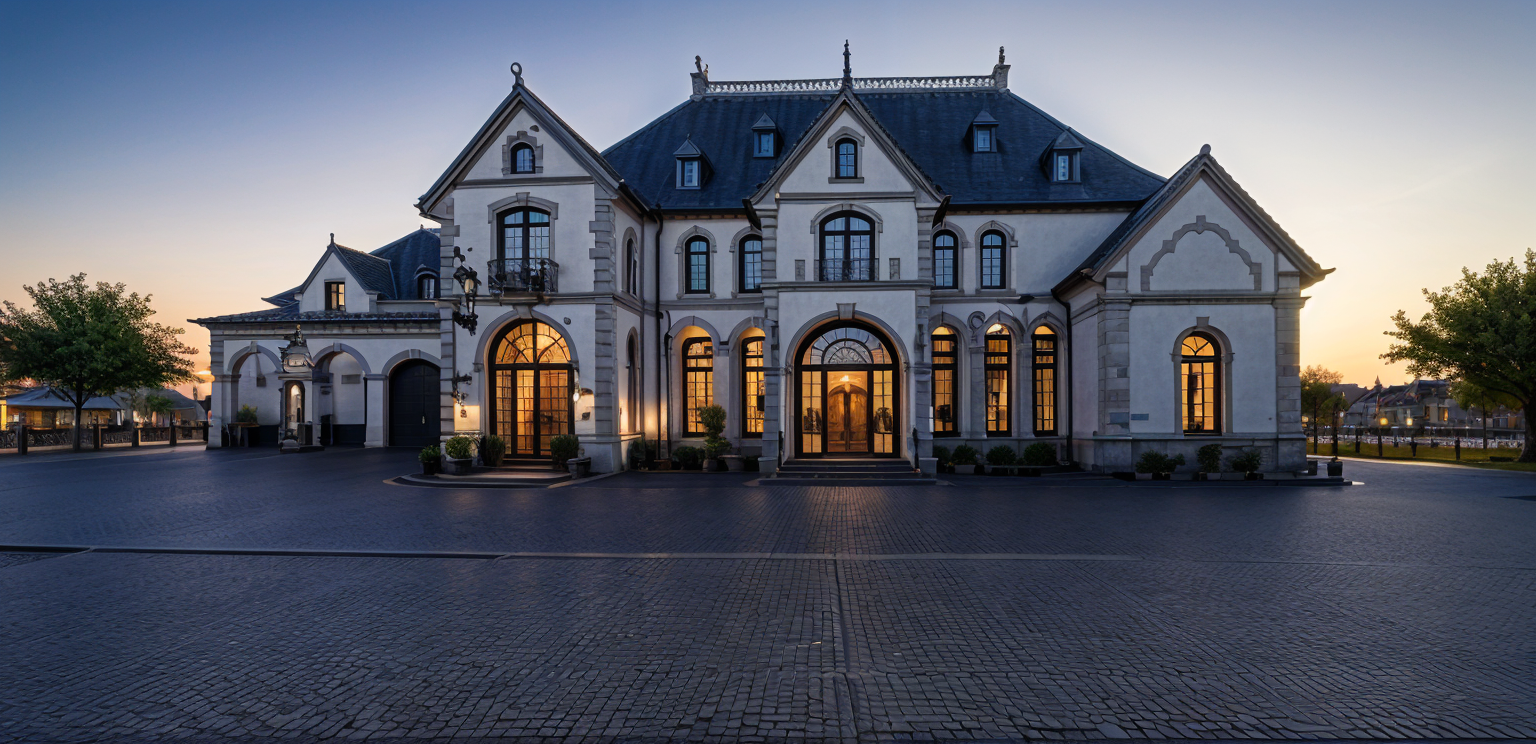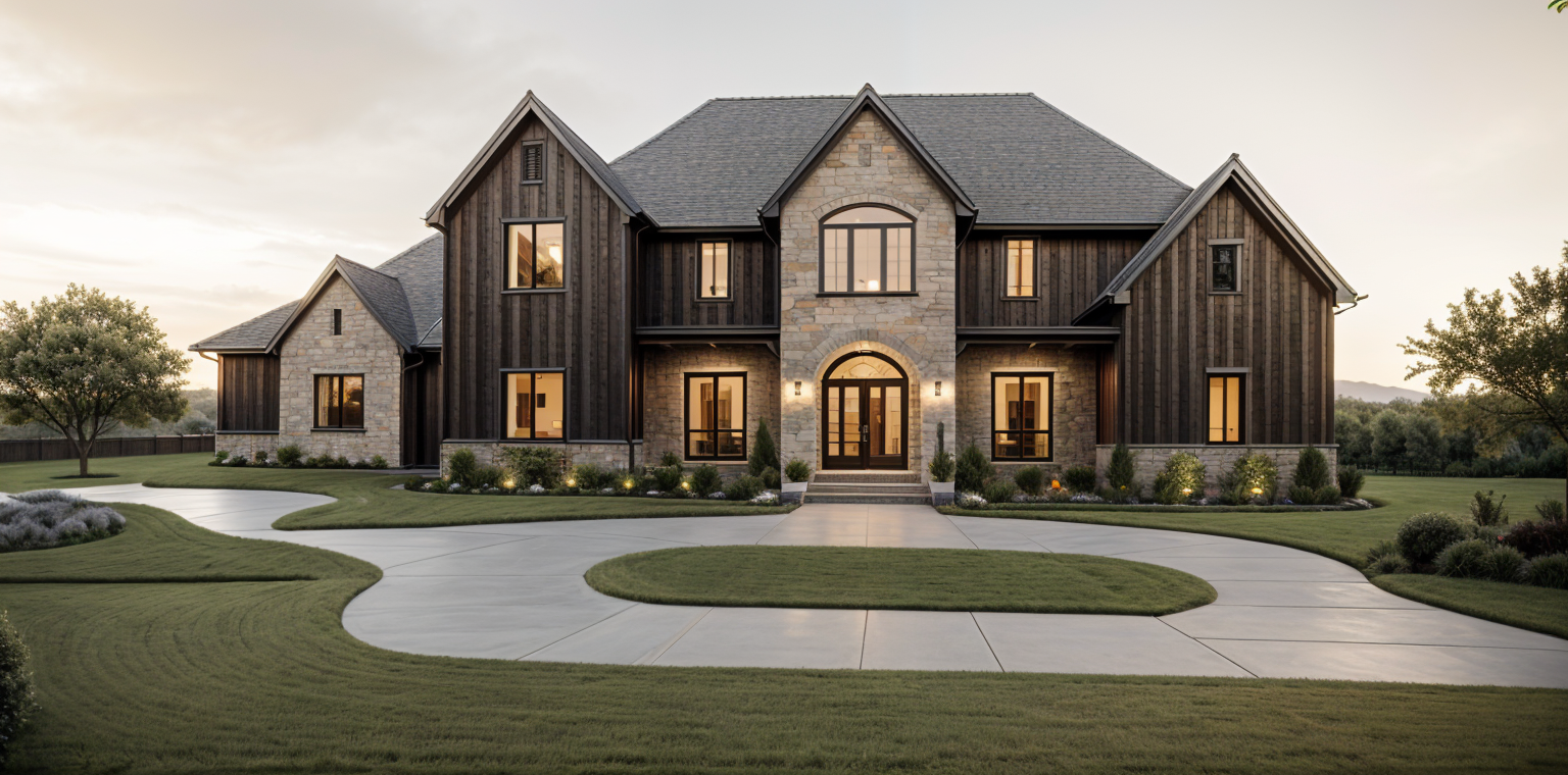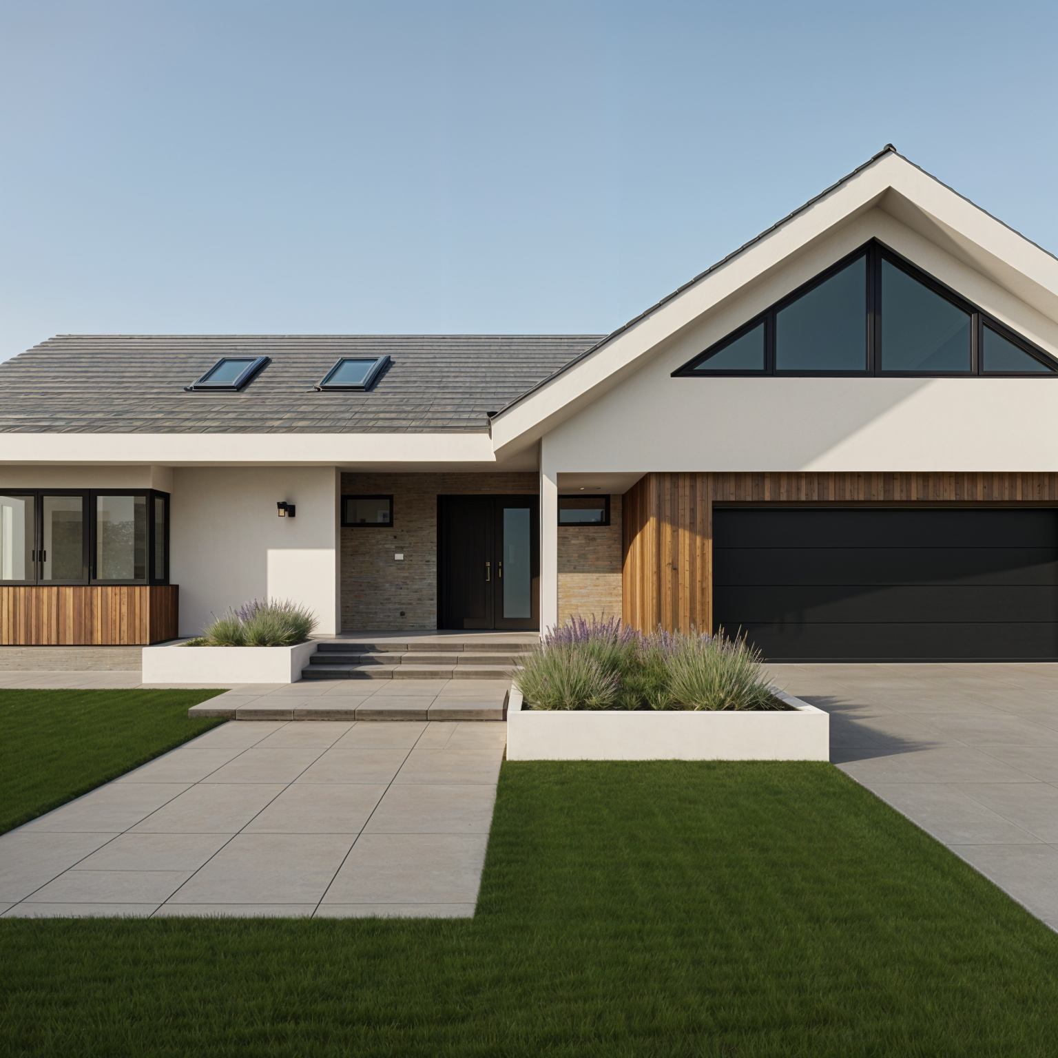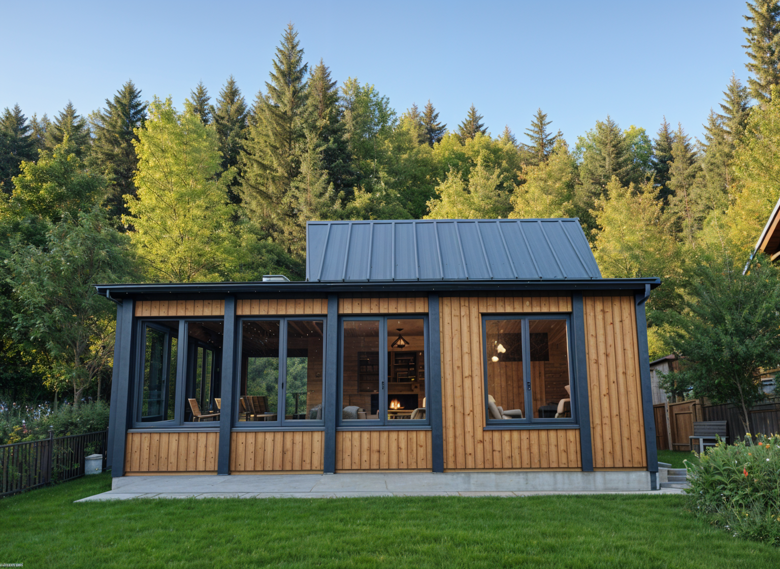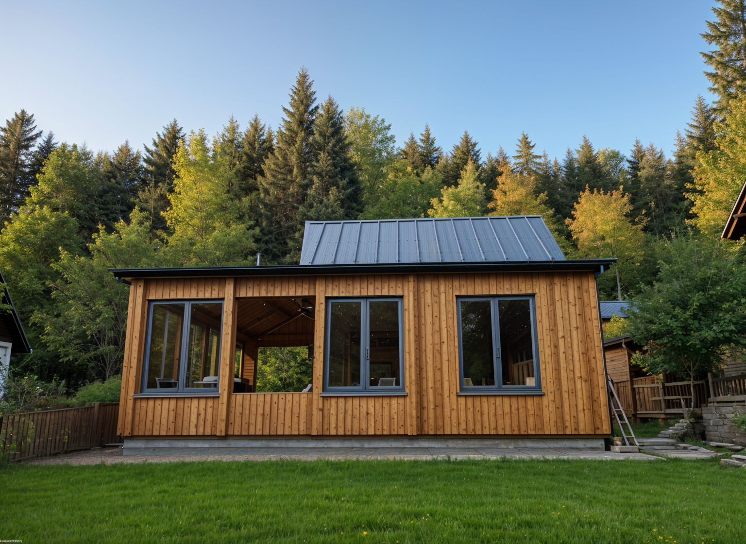 bauhaus exterior shot keep wood beams visible add grey double windows with no horizontal divider to all openings add facade from vertical light wooden stripes 15 cm add cottage interior add grass in front architecture