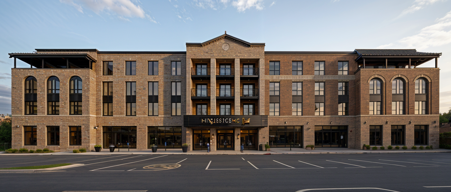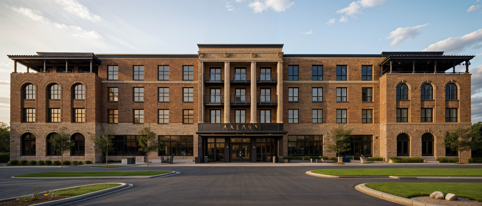 a western inspired luxury hotel in fort worth texas historic industrial architecture with stone and brick facades arched windows steel framing decorative masonry and a grand central entrance elegant but rugged inspired by historic breweries and warehouses adapted into modern hotels replace modern rooftop canopies with a elegant western inspired canopies