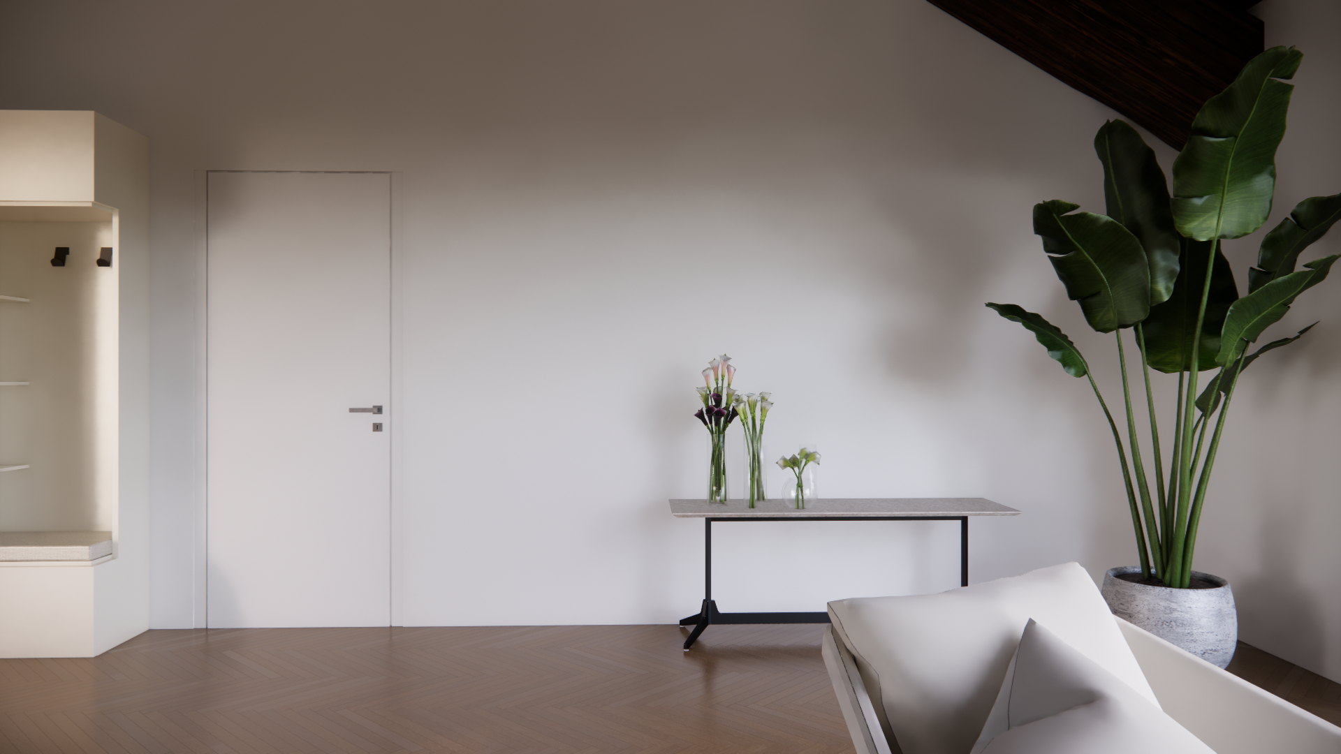 add paintings of various sizes on the white wall between the door and the plant do not modify the other elements present architecture