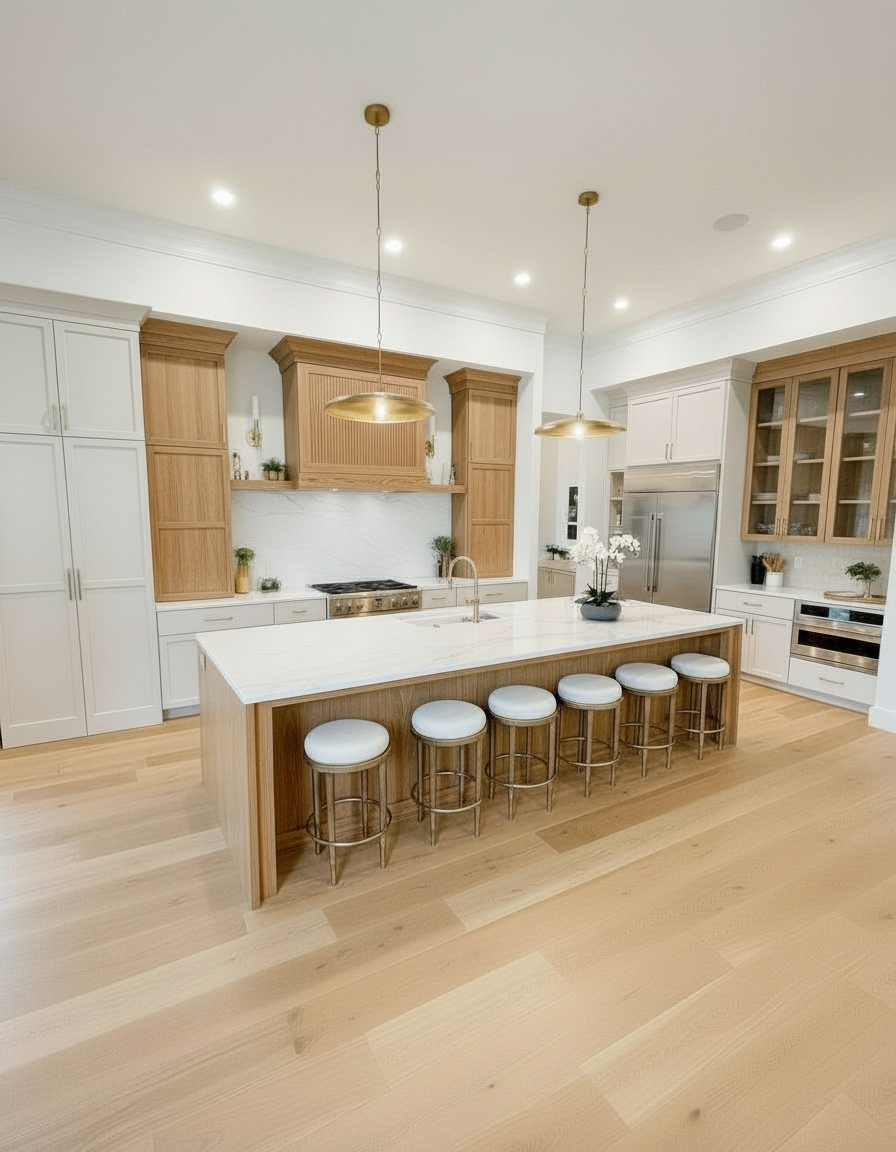 change only the cream colored cabinets to iron ore paint color leave the wood tone cabinets alone