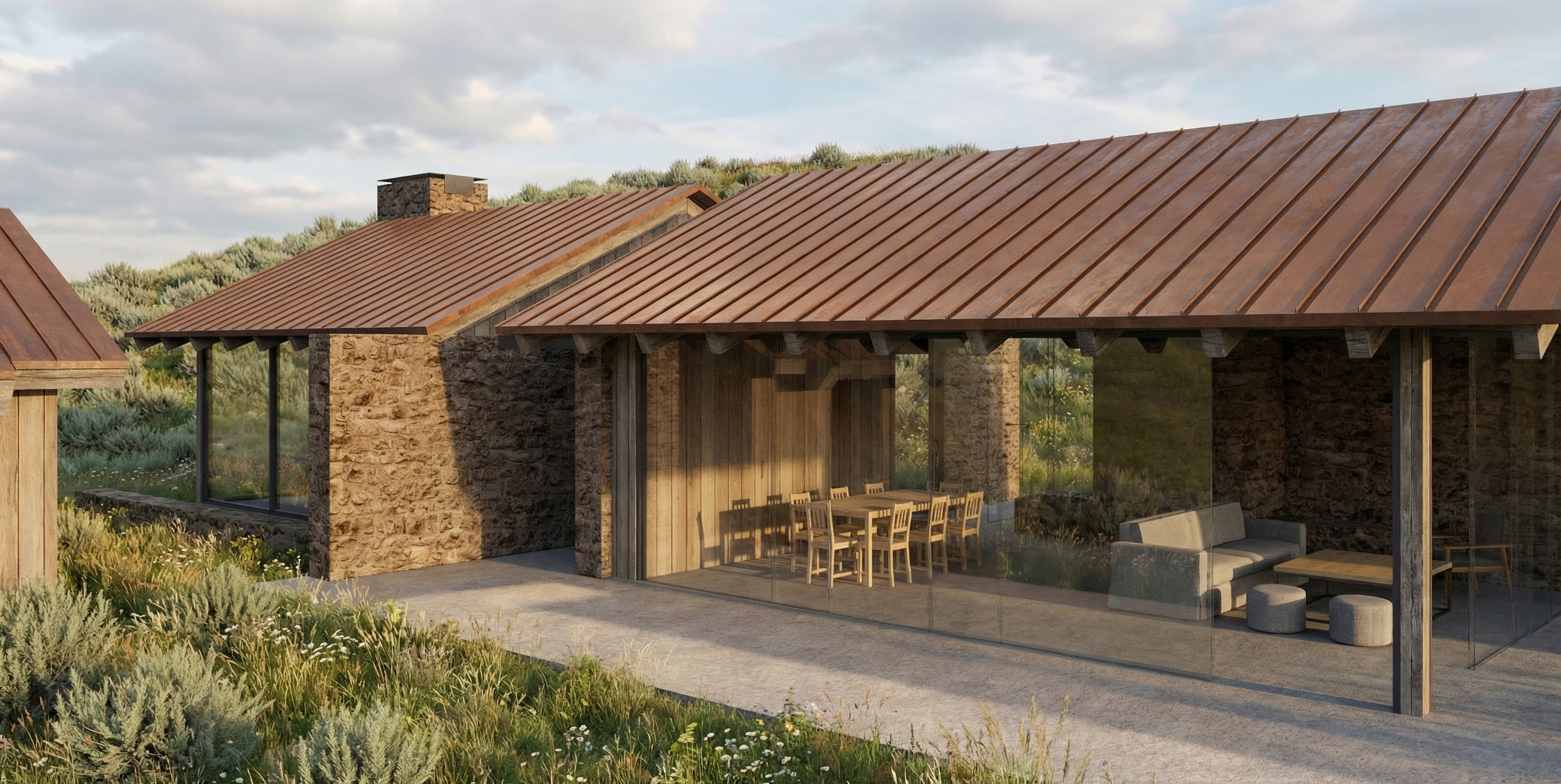 landscape hillside with sagebrush and tall wild grasses brown drystack stone walls corten standing seam metal roof clouds in the sky white oak dining table and chairs add fire to fireplace in curved wall