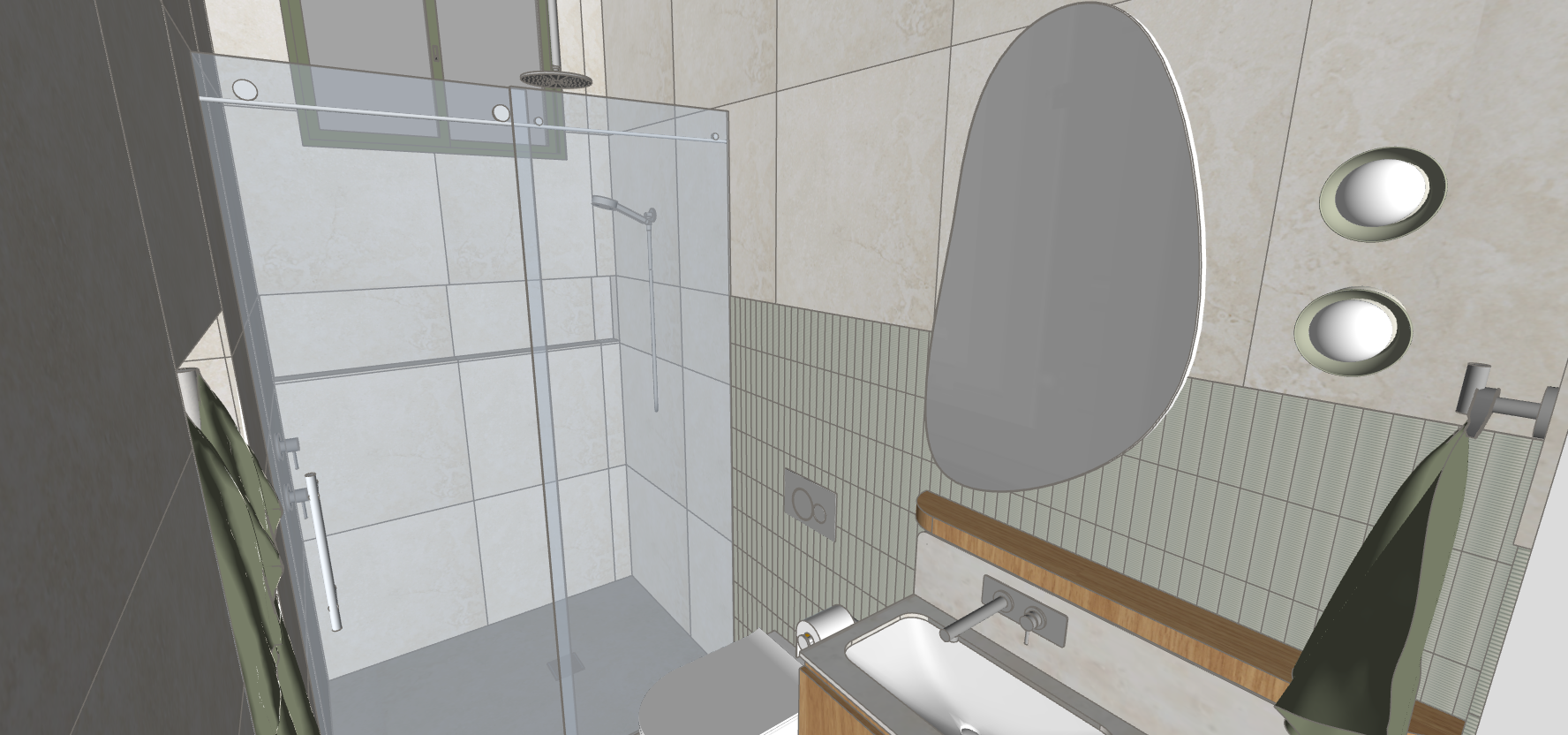 render this bathroom exactly like the image on the floor and walls is a 600x1200mm creamy beige tile with subtle veining behind the vanity is a mosaic finger tile with greens and whites veining through it run this tile from the floor to half way up the wall with the wall mounted tapware poking through make it one row less of the mosaic tile than the image for the height the section of wall with the mosaic tile goes from the right side of the vanity to the left of the toilet and stops at the shower screen it is at the same height add a timber shelf the width of the vanity with curved ends at 100mm deep as per the image there is a splashback above the vanity the same stone as the benchtop with rounded ends the tapware is poking through the splashback add warm light from the sconces green towels are hanging on the towel rails and the towel hook