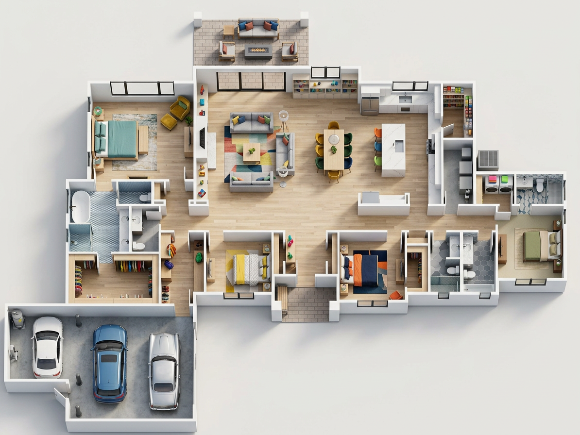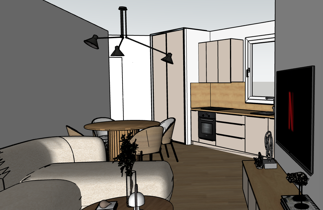 photorealistic modern japandi interior natural oak and cashmere grey finishes it is very important to preserve the black handles on the kitchen cabinetry the cabinet doors are cashmere grey and only the worktop and backsplash are made of natural oak warm neutral palette beige greige and soft wood tones elegant minimal styling soft daylight diffused warm lighting calm atmosphere realistic interior photography eye level camera wide angle shot highly detailed textures no distortion no clutter no people please keep all the furniture exactly as shown in the photo and do not change the chairs in the upper left corner there is a hallway not balcony doors please preserve the length of the wall also the tall cabinet next to the kitchen is separated by a white wall and beyond it there is already a wardrobe area with sliding doors