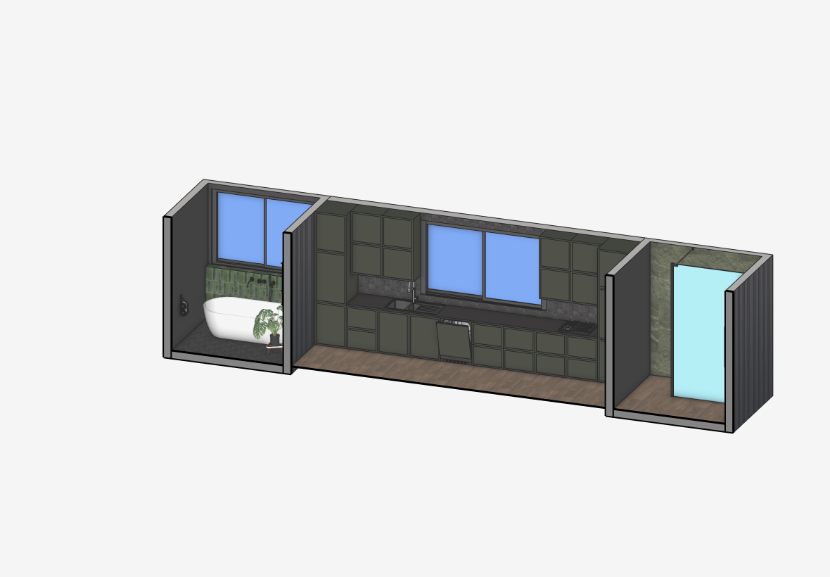 convert this floor plan into a realistic isometric 3d view of a full house show the space from an elevated angle with furniture walls and details visible create a beautifully rendered interior scene featuring a divided space on the left illustrate a luxurious shower area with a sophisticated dark green marble wall and sleek black fixtures and glass there s a green kitchen with a big window and black squared tiles and marble countertop next is a bathroom with a bath a plant and black tiles as well don t add anything else it s a cross section use the same furniture as shows on the plan do not change the orientation of the floorplan