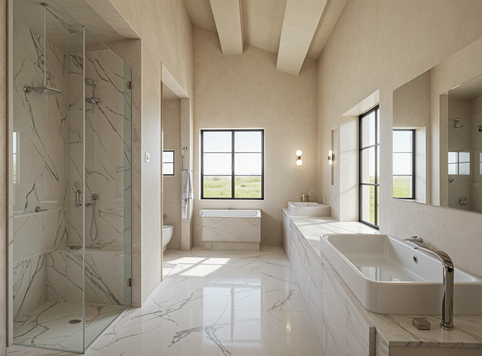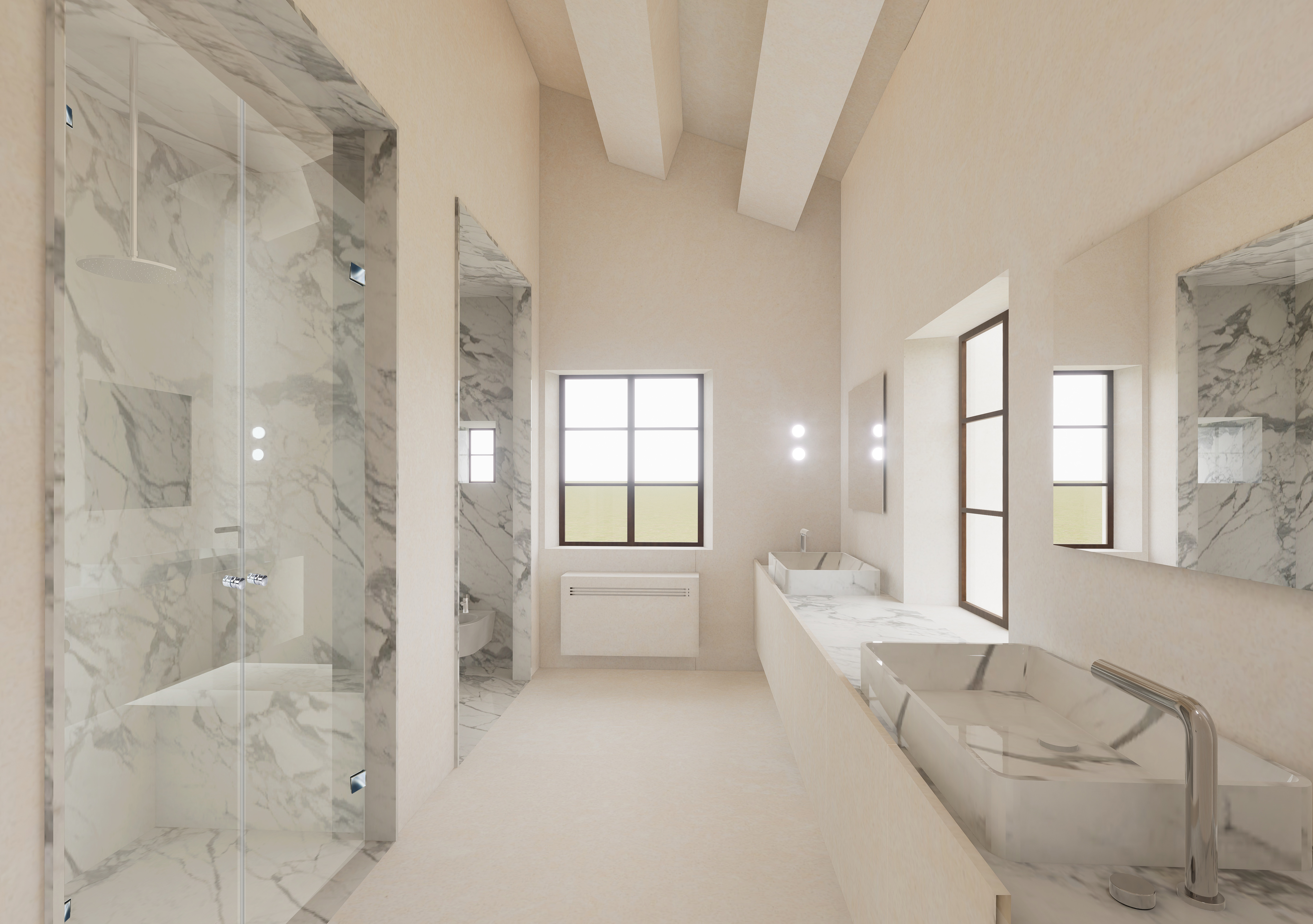 improve realism of luxury bathroom don t change fixtures and furnitures improve details on shower glass doors with chrome details bright light sunny calm atmosphere luxury design luxury wellness products on the cabinet