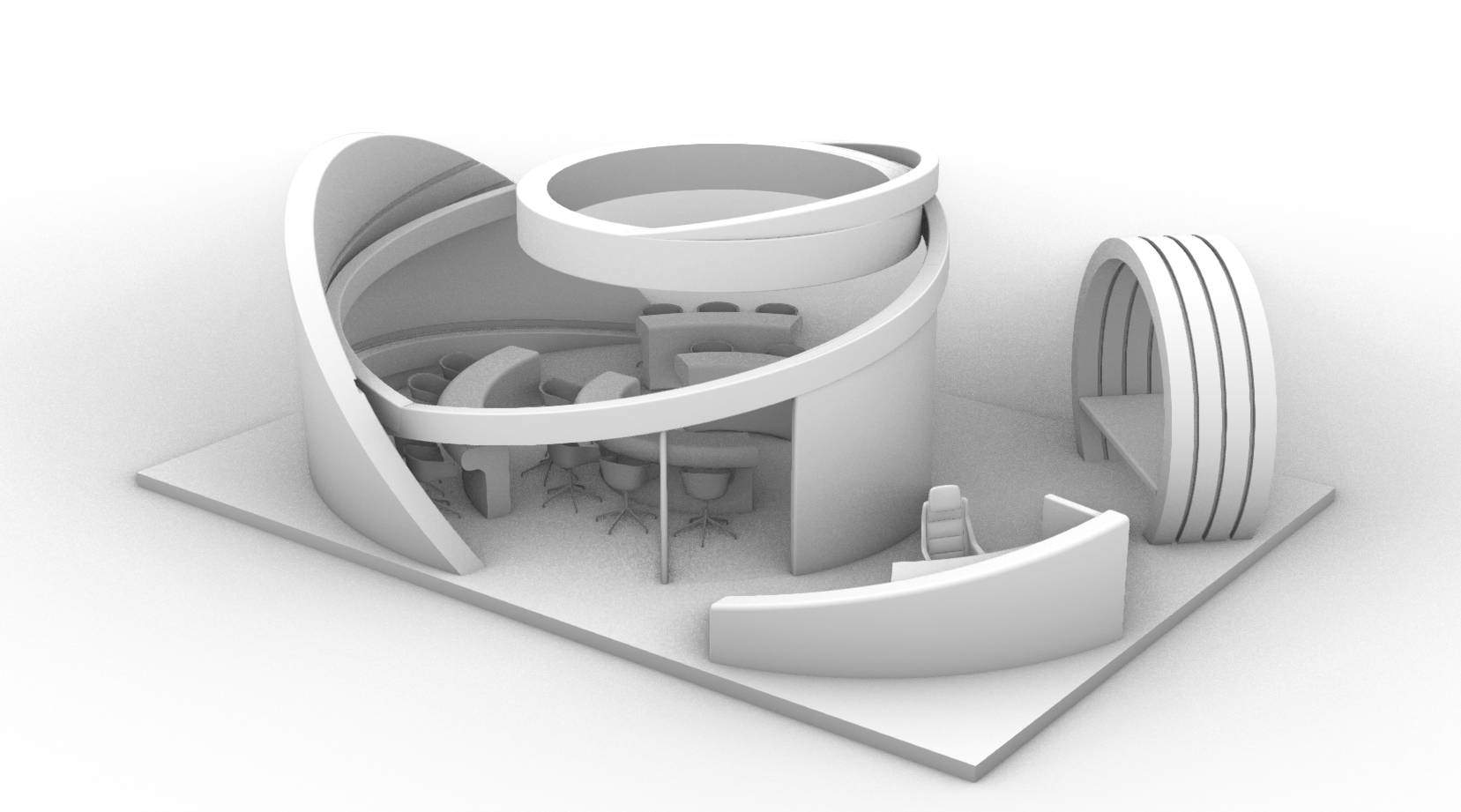 futurism perspective shot this is a booth inspired by a camera lense for a photogrophy exhibition the lense is present with the spiral lines from the plan top view we have a sitting booth on the corner and the reception on the opposite corners from the sitting booth on the corner their are lights inside and outside architecture