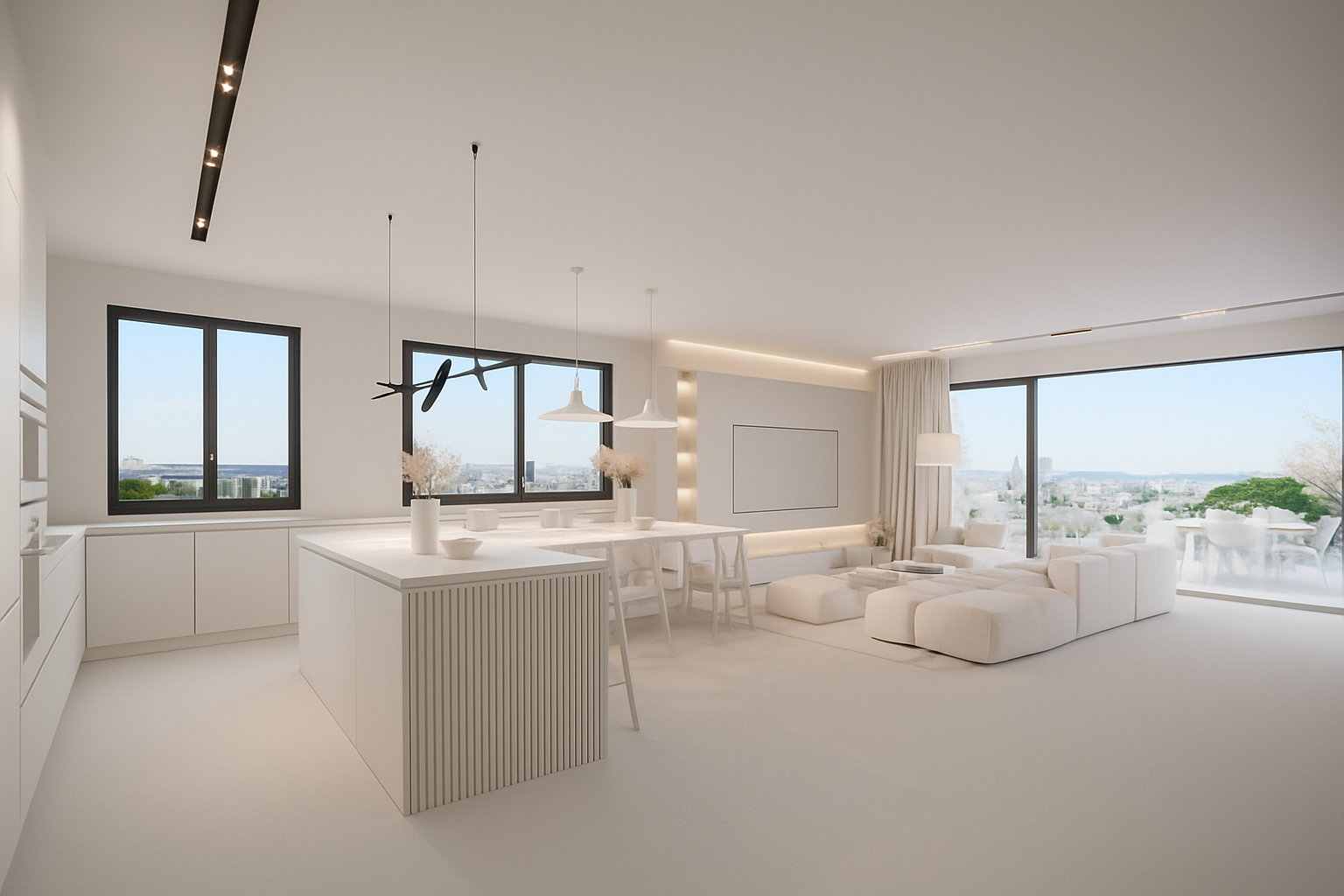 art deco interior shot modernist interior shot render a modern dining and kitchen area with a sophisticated and luxurious atmosphere use a soft warm ivory for the dining chairs and barstools to create a cozy appeal the dining table should be an elegant deep espresso brown giving it a rich look decorate the overhead chandelier with golden accents for a touch of luxury and a gentle warm glow the walls should be finished with a combination of matte white and textured gray panels for a contemporary feel incorporate a wooden partition with horizontal slats in dark walnut to balance the open space the kitchen counter should feature a sleek marble surface in a blend of whites and soft grays complemented by stainless steel fixtures for a modern touch use recessed ceiling lights and pendant lights in black and gold to provide soft ambient lighting add subtle green plants and metallic decor items on the shelves for a hint of color and style the overall atmosphere should be a mix of modern sophistication and inviting warmth in the living room infront of the tvtheir is a low and small coffee table out side in the balcony the deck is made out of brown wood and the plants are green and flowery the sofa is in pistacio green colors architecture
