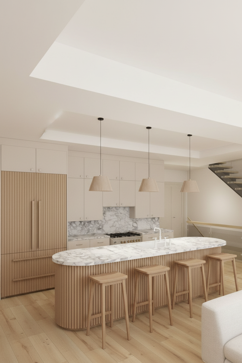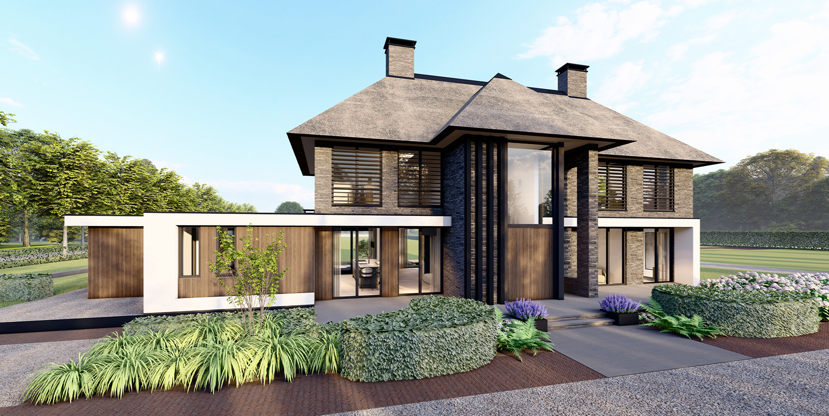 exterior shot render a modern house with a bright serene atmosphere the roof should be a soft beige complementing the dark charcoal wood siding of the building large clear glass windows reflect the light from the sky adding a sense of spaciousness surround the house with lush greenery featuring various shades of light and dark green the distant sky is a soft blue with hints of light clouds create an inviting and tranquil ambiance emphasizing natural light