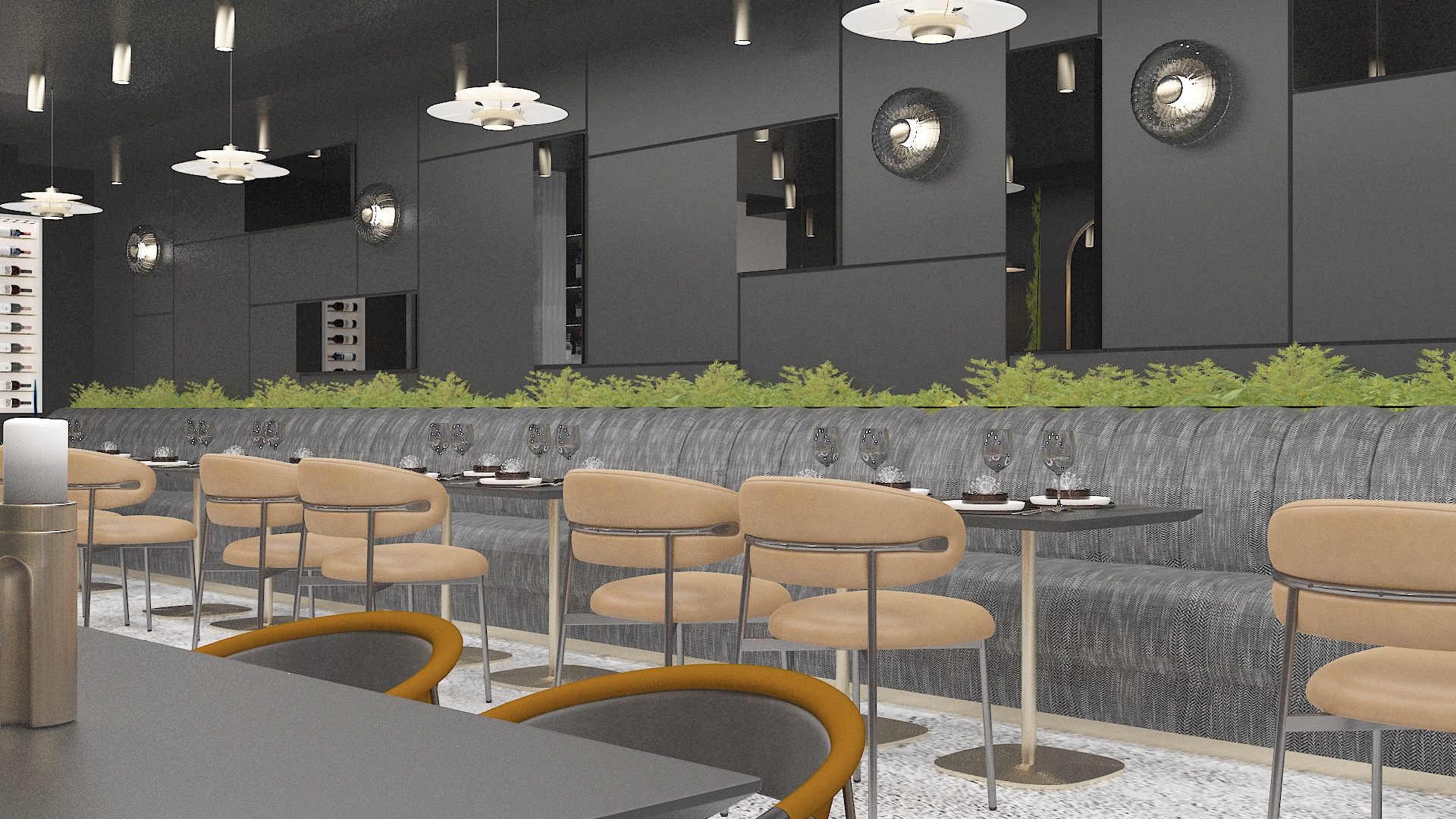 create hyper realistic and sophisticated and artistic restaurant interior with an inimate atmosphere the space features cold black walls with gray black mirrors concrete floor tiles sophisticated accent gold details potted plants ultra realistic for a biophilic touch fabric on the sofa and chairs made ultra realistic the lightening is soft and golden with soft shadows creating depth elegance the overall composition blends modern design with artistic and quite luxury aesthetic refined tactile and contemporary influence no additins no removals no rearangement no stylization no cgi look do not change materials or colour