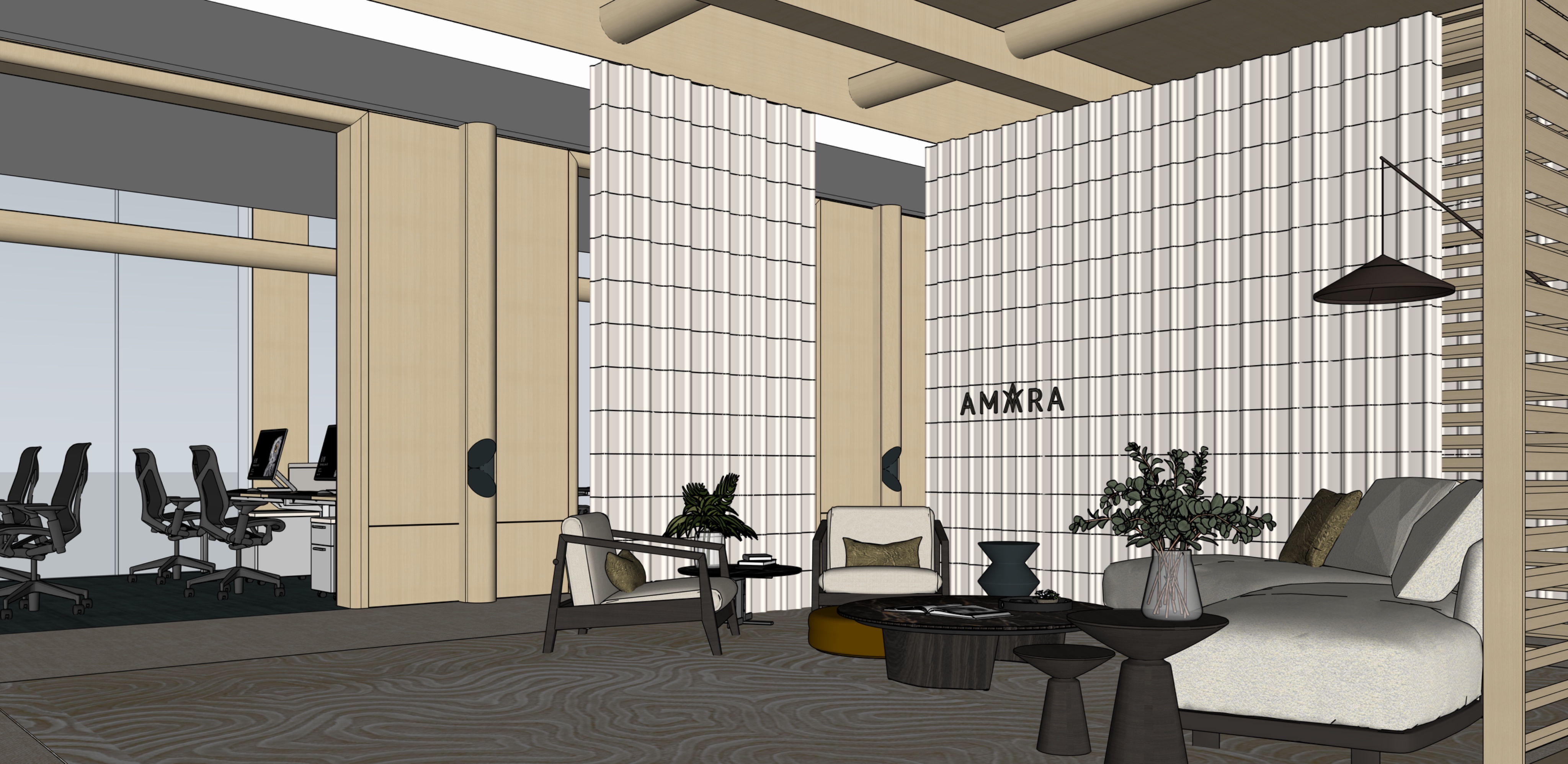 lower natural lighting coming from the window to down to 50 keep the tone and colour of materials of wood and blocks and furniture cove lighting to be softer interior brightness to increase to 60 the floor in between blue carpet and textured carpet is an off white carpet make the texture of the carpet in multi level loop finish add soft strip uprights from the beams to illuminate the ceiling long and short beams